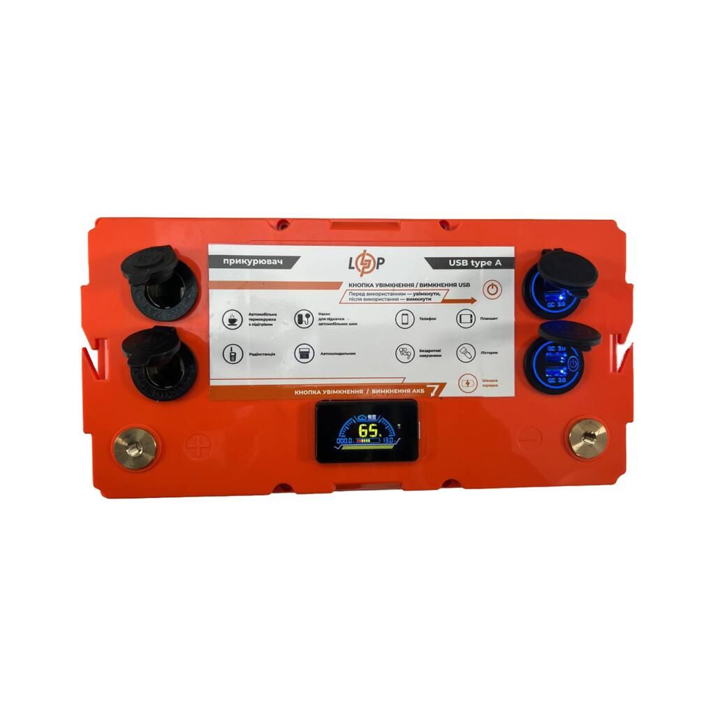 Акумуляторна батарея оснащена дисплеєм, двома автомобільними розетками 12В та чотирма зарядними портами USB type A