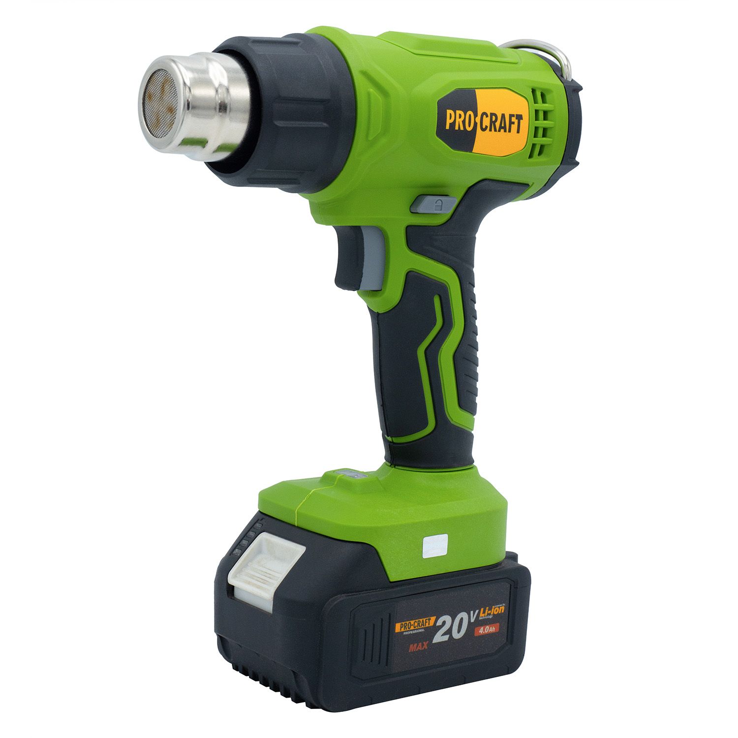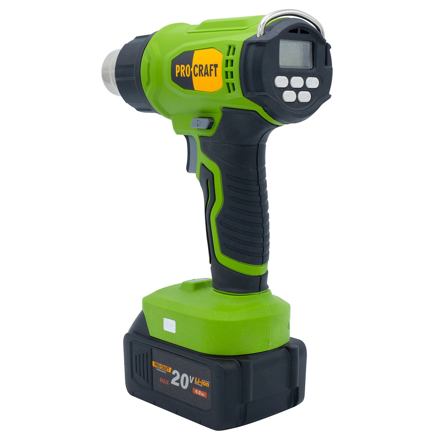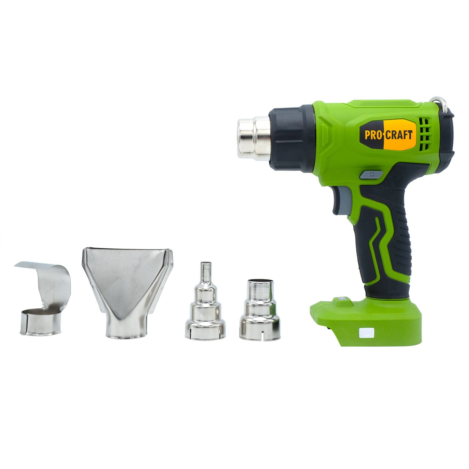 Procraft PH24 — мобільний акумуляторний термофен для виконання будівельних, монтажних або ремонтних робіт, де потрібен контрольований нагрів. Працює від 20 В акумулятора (не входить у комплект), має регульовану температуру нагрівального елементу від 50 до 550 °C та повітряний потік 170–210 л/хв. Завдяки невеликій вазі (всього 0,84 кг у зборі) фен зручний для тривалої роботи однією рукою. Ідеально підходить для пайки, сушіння, зняття фарби тощо.