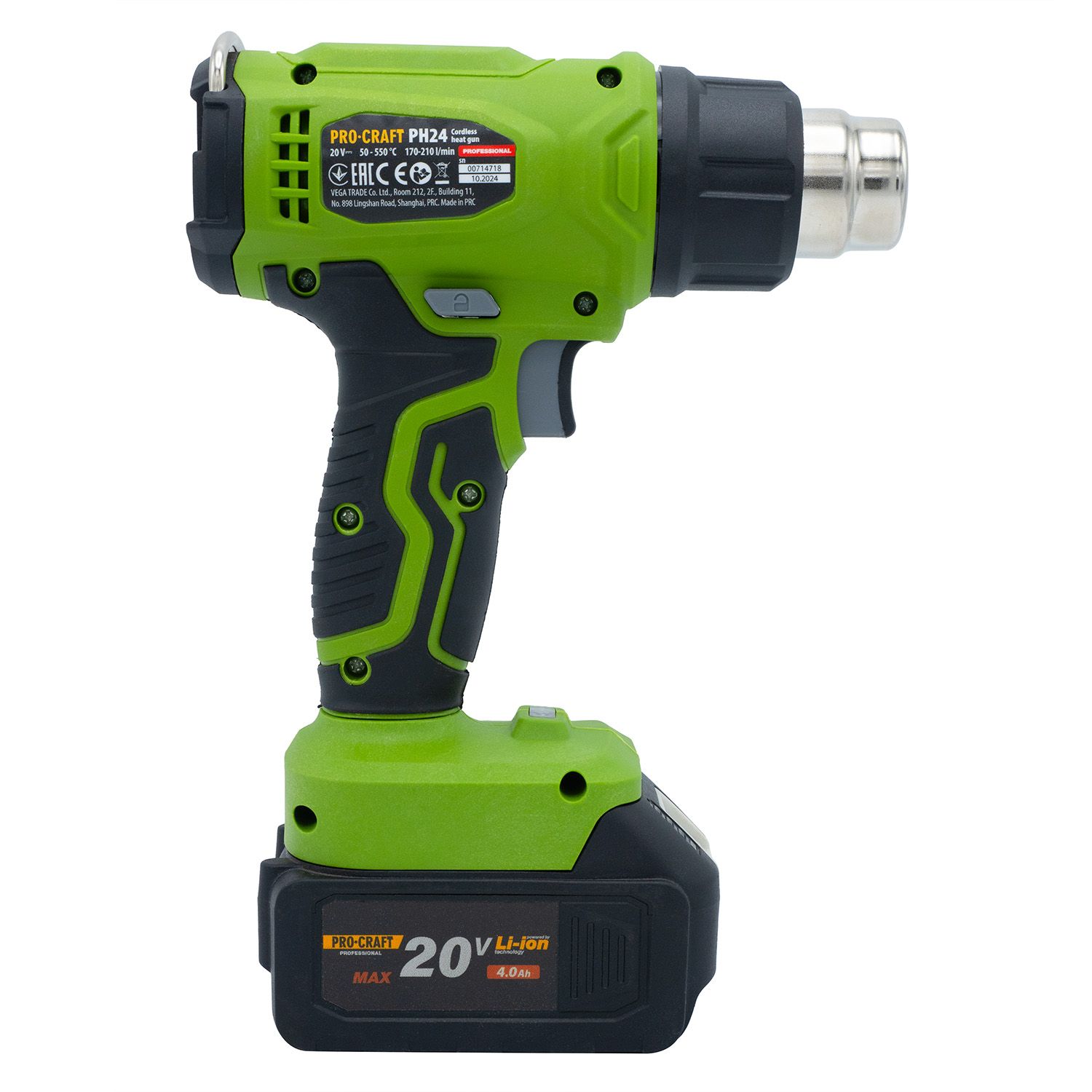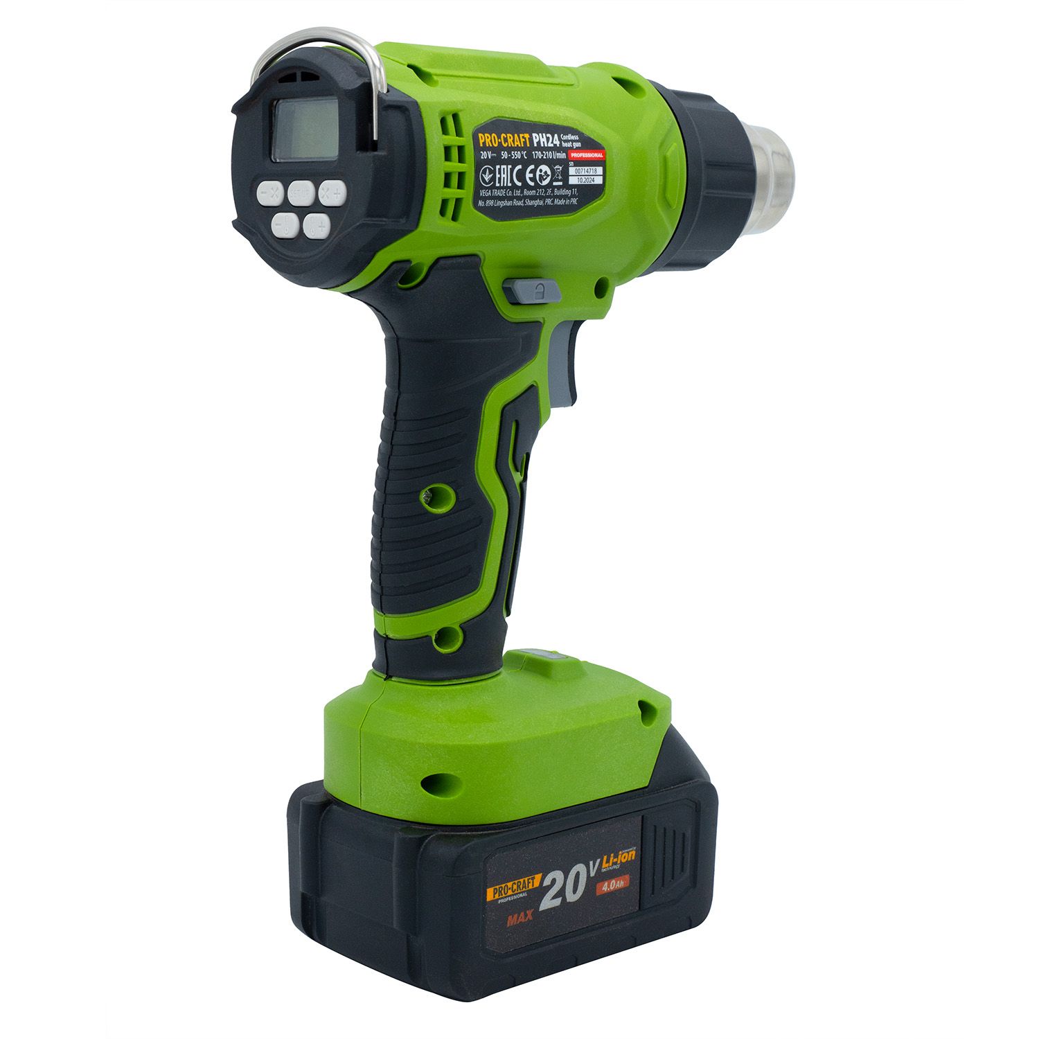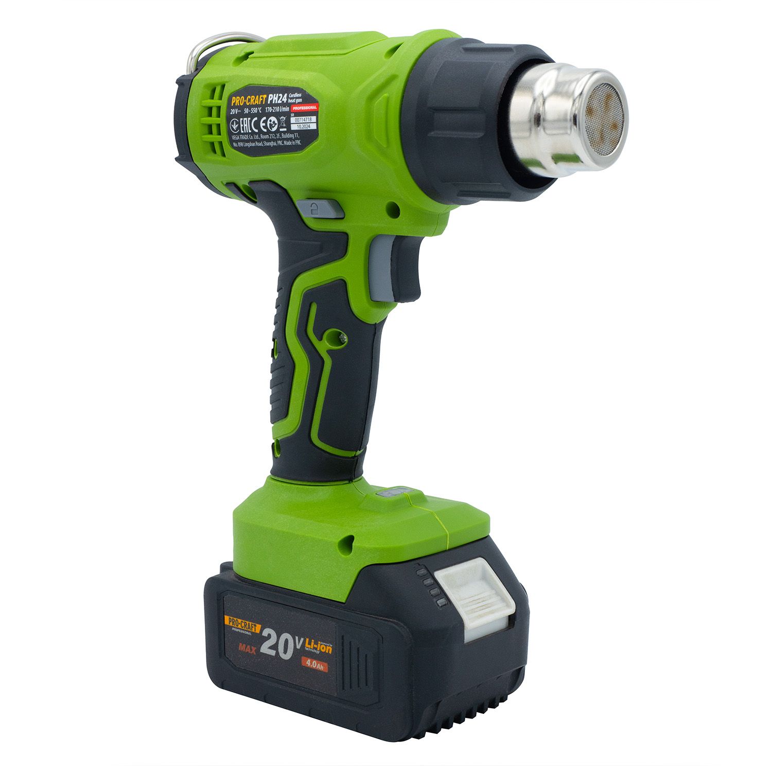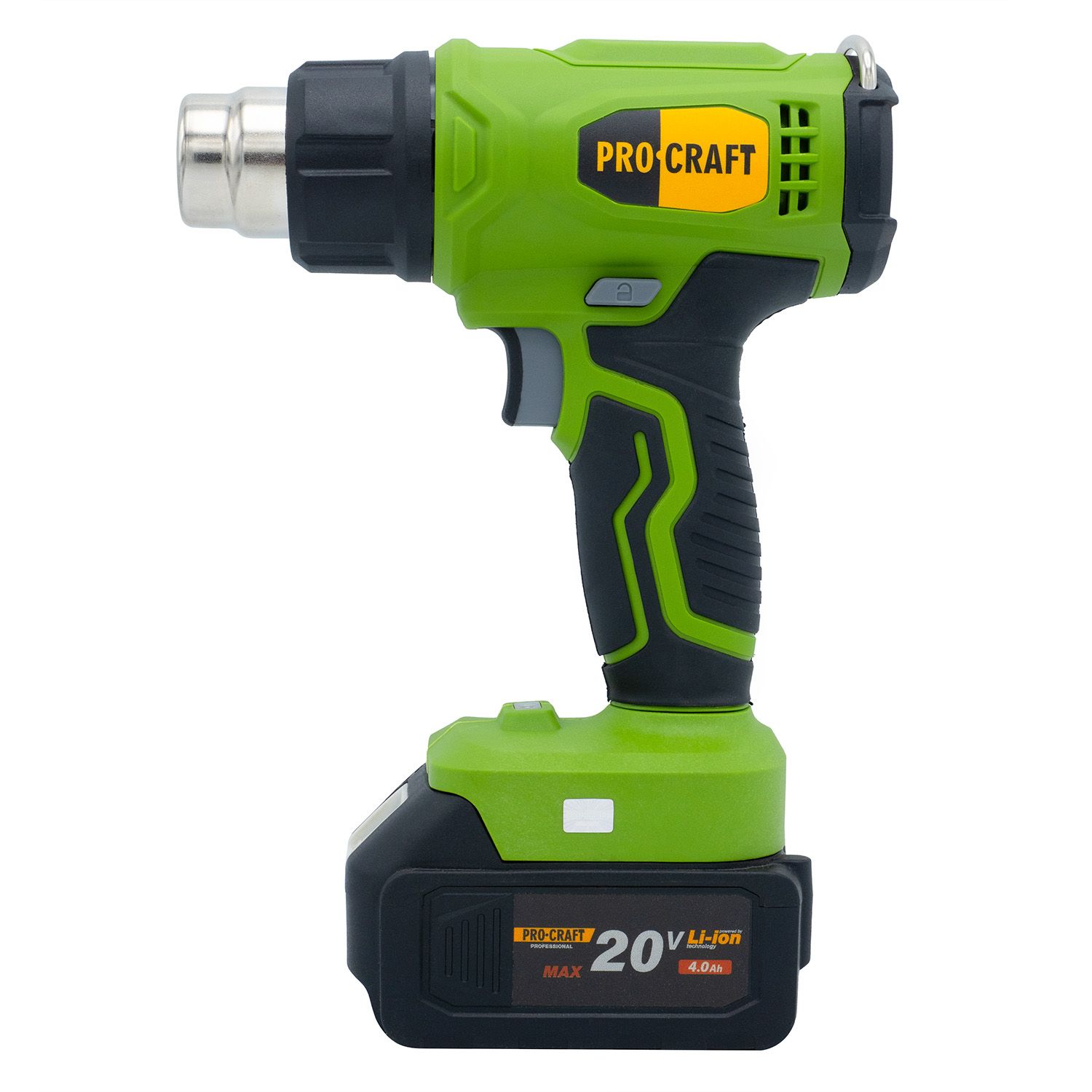 Procraft PH24 — мобільний акумуляторний термофен для виконання будівельних, монтажних або ремонтних робіт, де потрібен контрольований нагрів. Працює від 20 В акумулятора (не входить у комплект), має регульовану температуру нагрівального елементу від 50 до 550 °C та повітряний потік 170–210 л/хв. Завдяки невеликій вазі (всього 0,84 кг у зборі) фен зручний для тривалої роботи однією рукою. Ідеально підходить для пайки, сушіння, зняття фарби тощо.