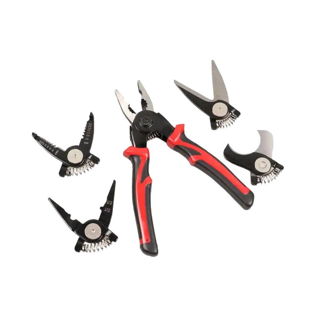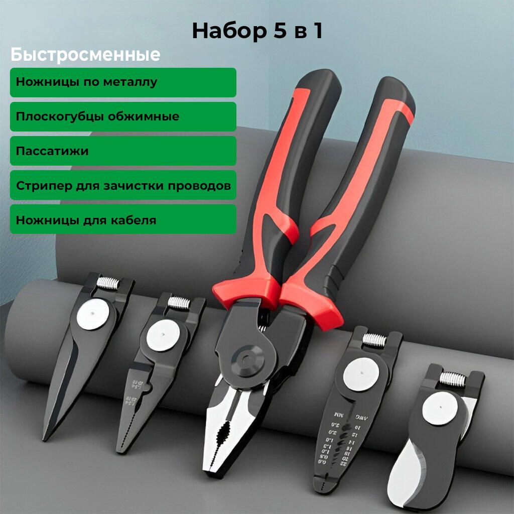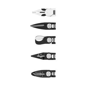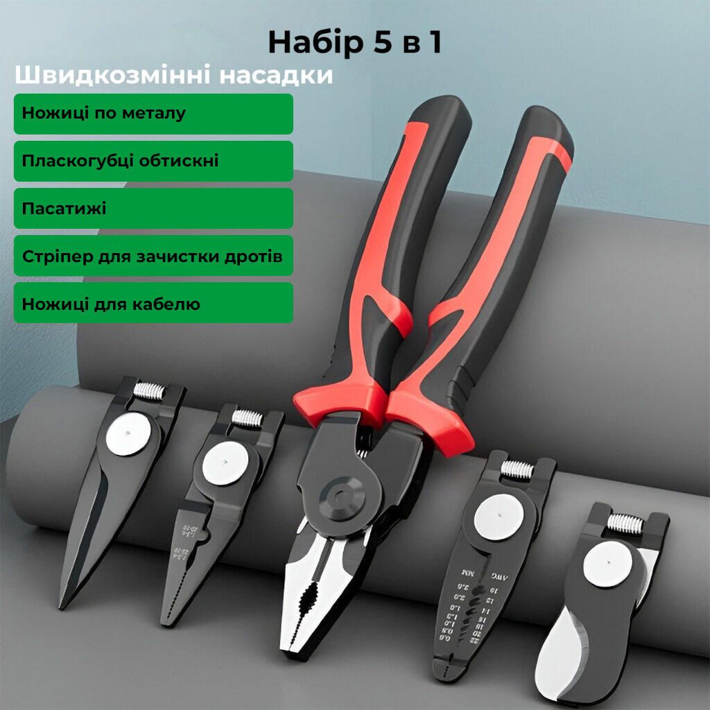 Багатофункціональний набір швидкозмінних інструментів 5 в 1 - дозволить вам виконувати різні роботи без зайвих інструментів – просто змініть насадку і плоскогубці перетворяться на кусачки, бокоріз, стрипер або ножиці по металу.