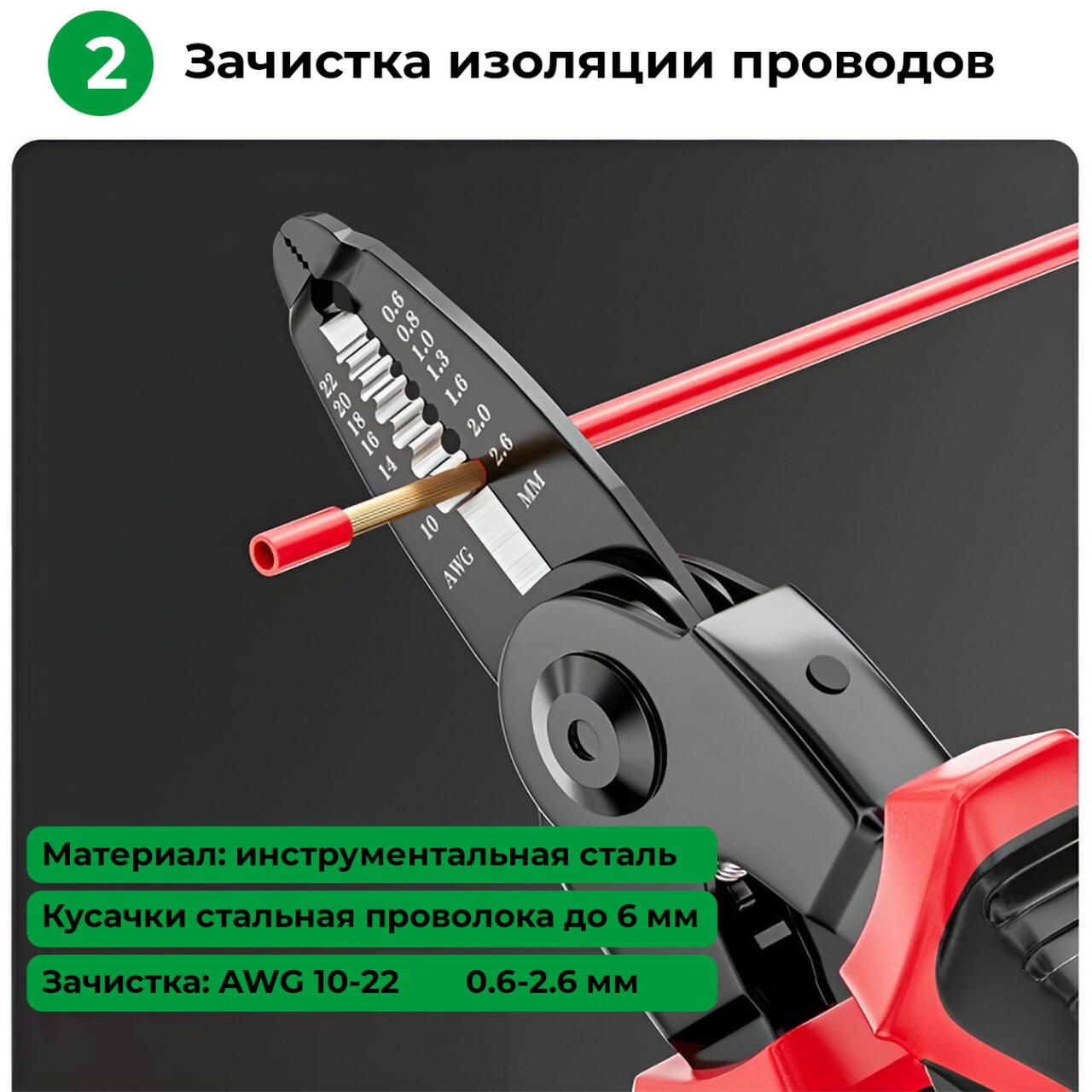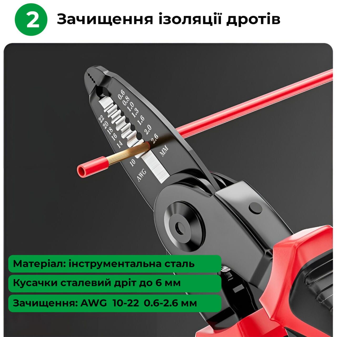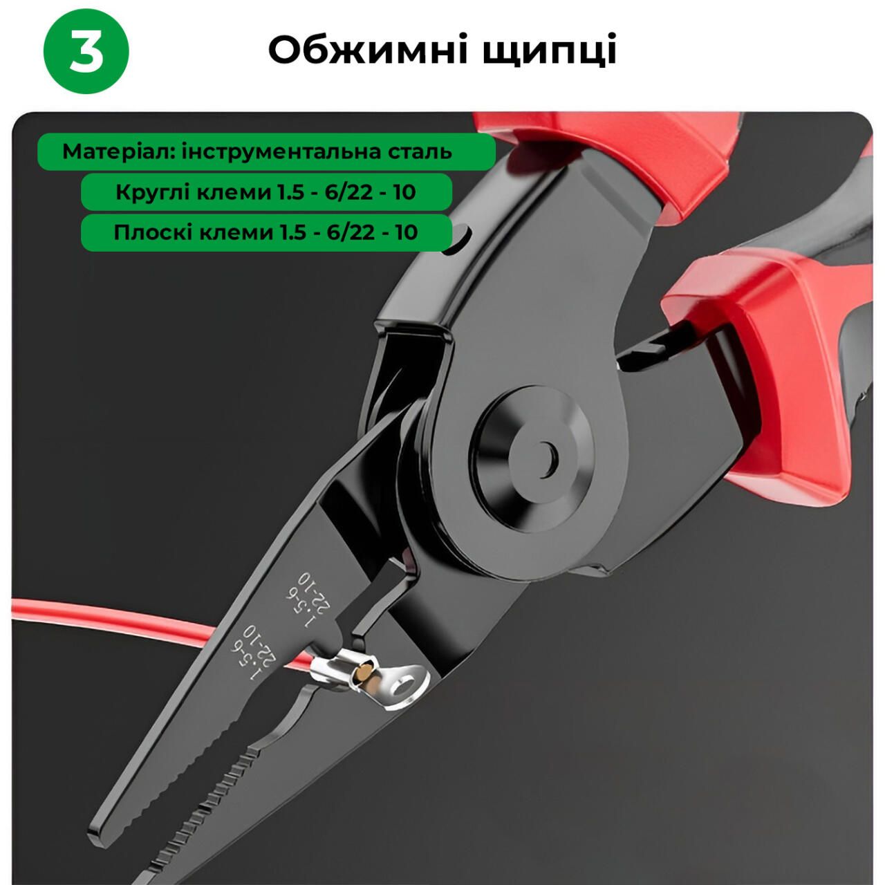 Багатофункціональний набір швидкозмінних інструментів 5 в 1 - дозволить вам виконувати різні роботи без зайвих інструментів – просто змініть насадку і плоскогубці перетворяться на кусачки, бокоріз, стрипер або ножиці по металу.
