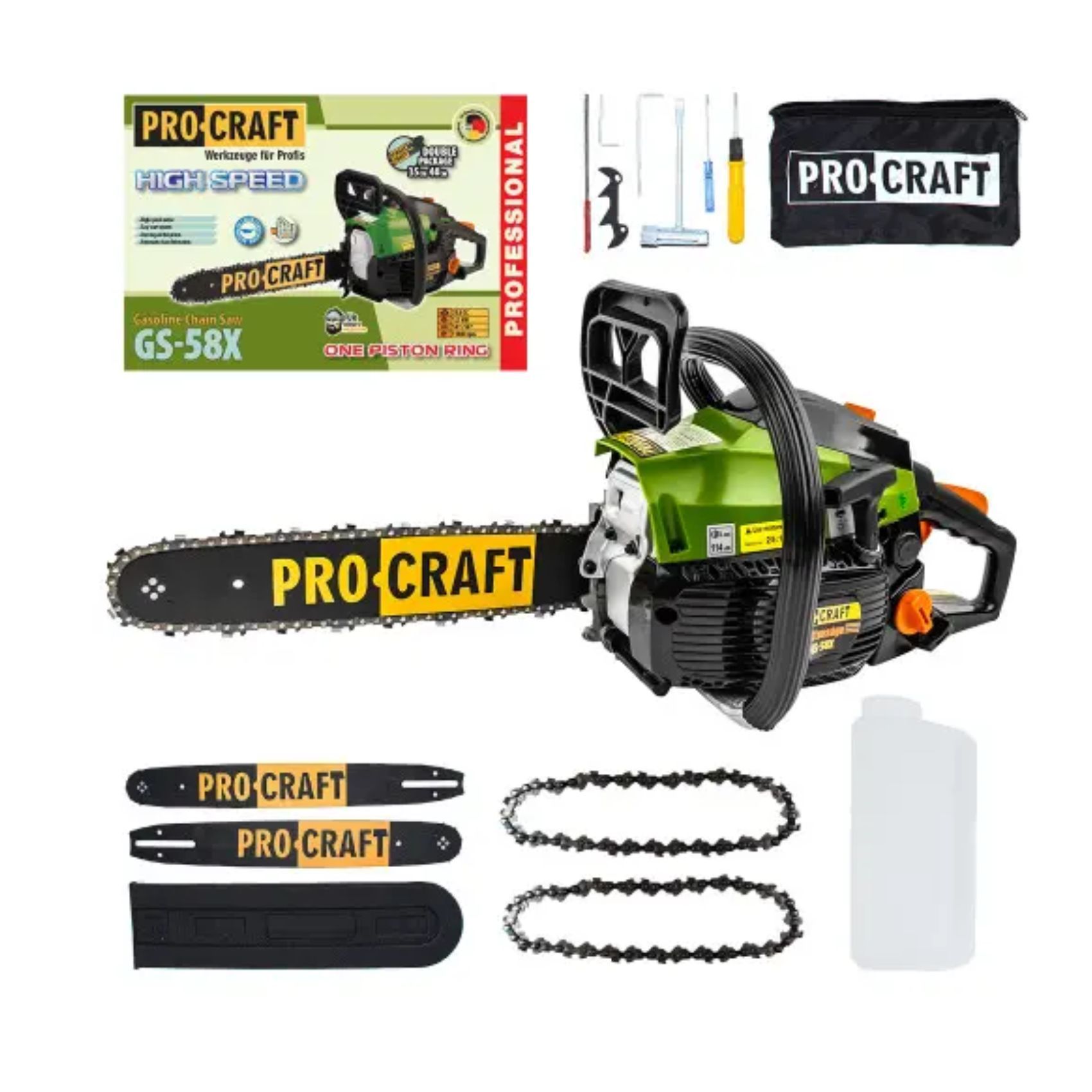 Переваги бензопили Procraft GS-58X: - Потужний двигун дозволяє швидко і легко зробити потрібний розріз. - Автоматичне змащування ланцюга забезпечує тривалий термін експлуатації. - Зручна довжина шини дозволяє ефективно працювати з різними розмірами матеріалів. - Легка вага бензопили робить її зручною для перенесення та використання. - Крок ланцюга забезпечує стабільну різку і швидко виконання завдань.