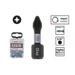 Інші унікальні властивості біти Bosch Impact Control PH2x25 мм (2607002803): - Довжина біти 25 мм; - Розмір - PH2; - Відмінні характеристики для шуруповертів із високими обертами; - Призначена для закручування та відкручування різних типів кріпильних елементів.