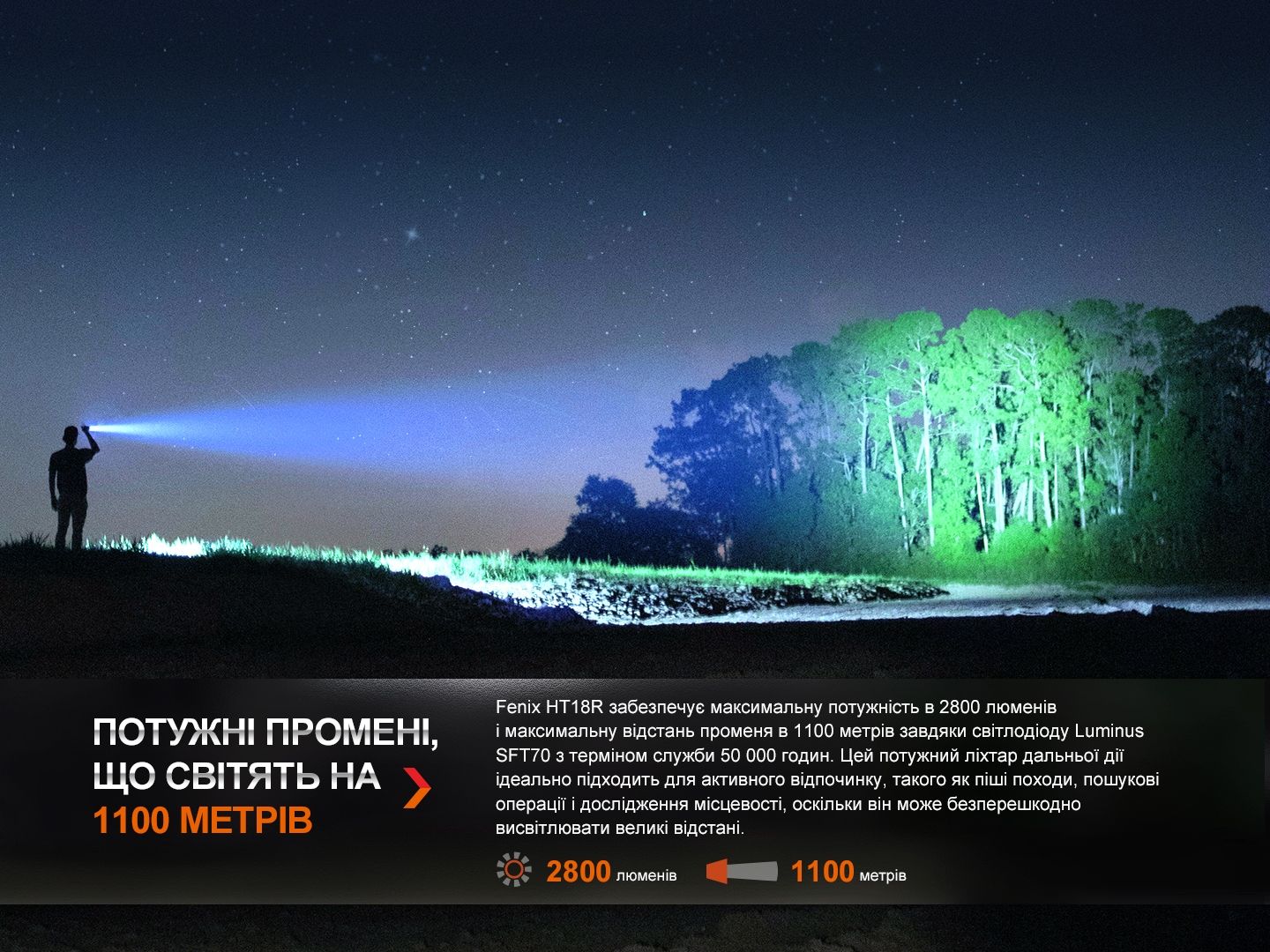 Дальнобійність: Завдяки використанню потужного джерела світла і оптичного обладнання високої якості, ліхтар Fenix HT18R має дальнобійність до 1000 метрів. Це дозволяє користувачу бачити далеко вперед і не мати обмежень в зоровій перспективі.