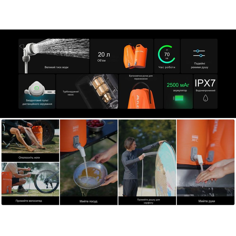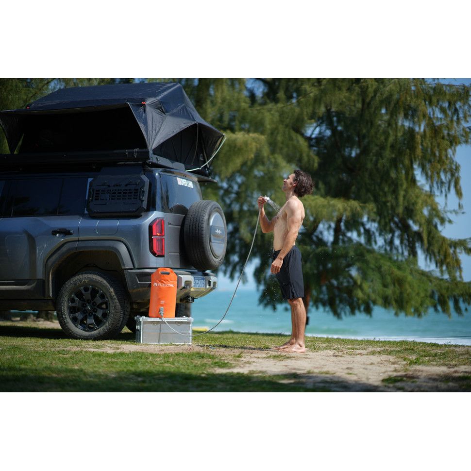Контейнер для води з електричним насосом Flextail Tiny Shower Bucket призначений для автономного водопостачання з функцією душу в польових умовах. Модель підходить для кемпінгу, експедицій на позашляховиках, подорожей в автодомі, відпочинку на пляжі або дачі. Конструкція дозволяє приймати душ і виконувати побутові завдання без підключення до водопроводу чи електромережі.