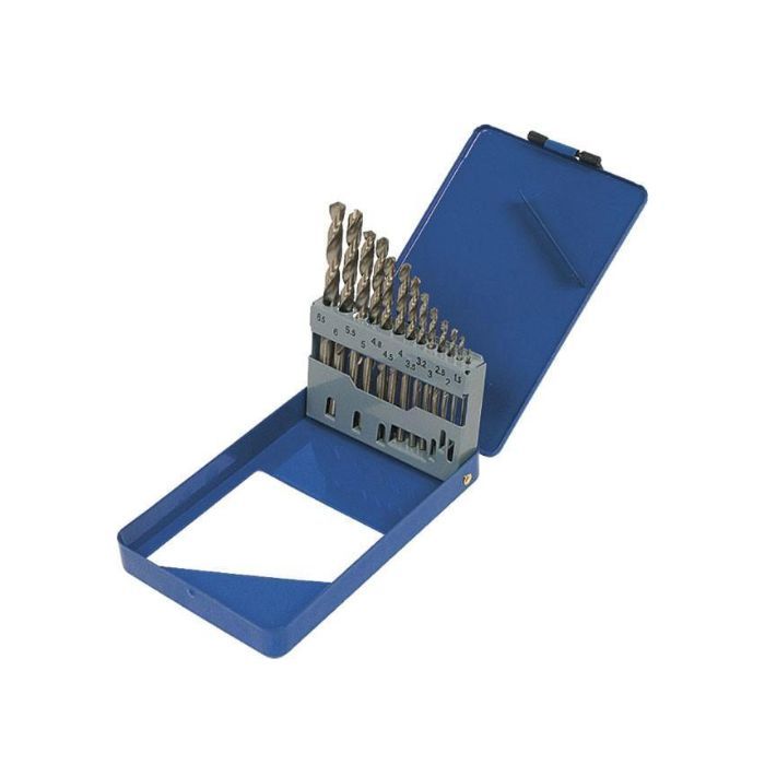 Набір свердл по металу Р6М5 білих 1,0-10,0мм 19шт (мет. коробка) - це високоякісний набір свердел, який призначений для роботи з металом. Кожен свердло має діаметр від 1,0 до 9,5 мм і виготовлено з міцної сталі. Хвостовик свердла циліндричний, що забезпечує його надійне кріплення в головці. Свердла мають гвинтову (спіральну) форму, що полегшує процес свердління і забезпечує відведення стружки. Цей набір є незамінним інструментом для професіоналів і любителів ремонту. Він має велику кількість розмірів, що дозволяє свердлити отвори різної діаметру. Завдяки своїй великій міцності та довговічності, ці свердла дозволяють ефективно працювати навіть з важкими металами. Вони ідеально підходять для свердління отворів в металевих деталях, машинобудуванні, автомобільній промисловості та багатьох інших сферах застосування.