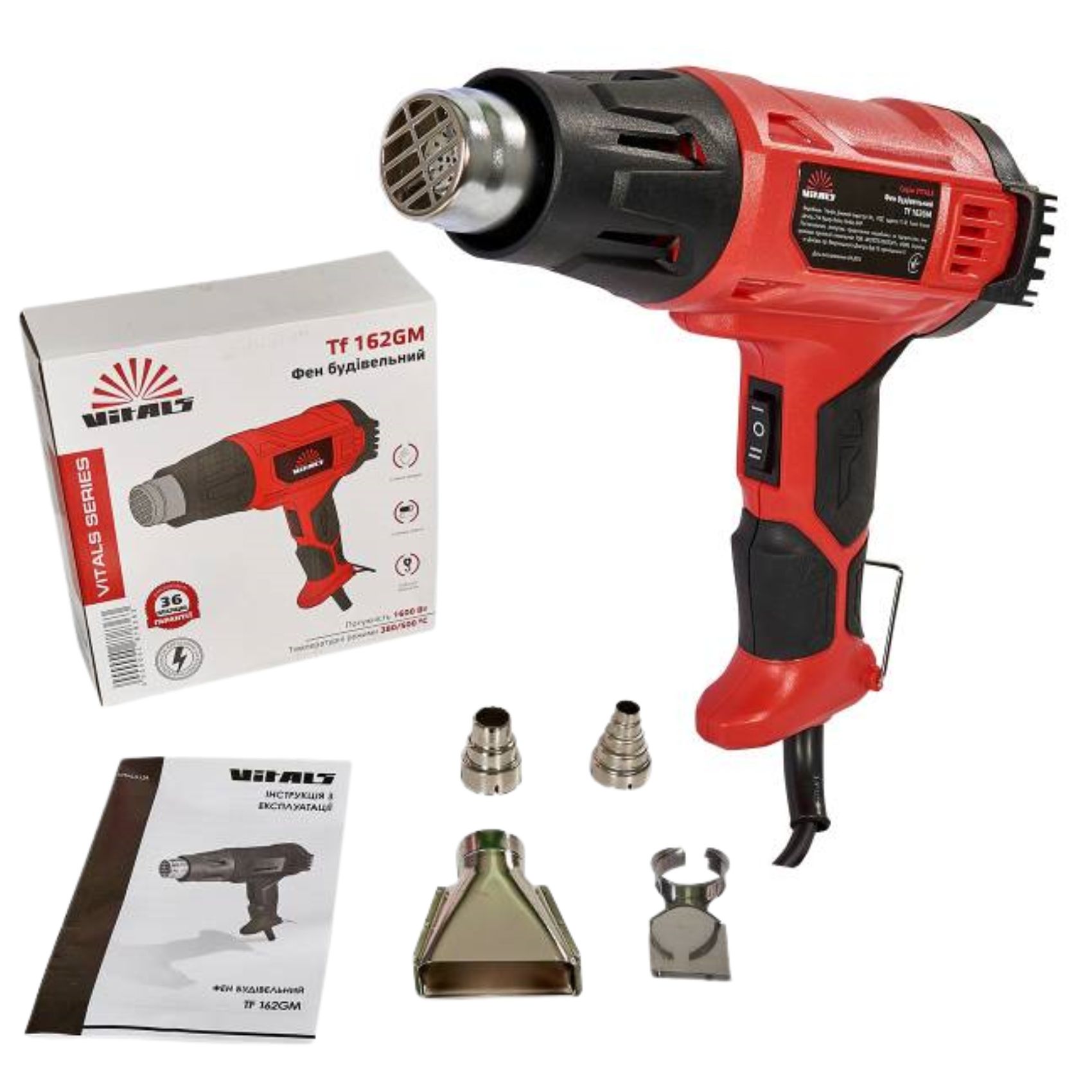 Фен будівельний Vitals Tf 162GM - потужний і надійний інструмент для швидкого висихання фарби та лаку, склеювання заготовок зі штучного матеріалу та зсування плівок. Завдяки напрузі 230 В та споживаній потужності 1600 Вт, фен забезпечує ефективне і швидке висихання та обробку поверхонь. Широкий набір функцій та особливостей робить цей фен незамінним помічником в будь-якій будівельній роботі.