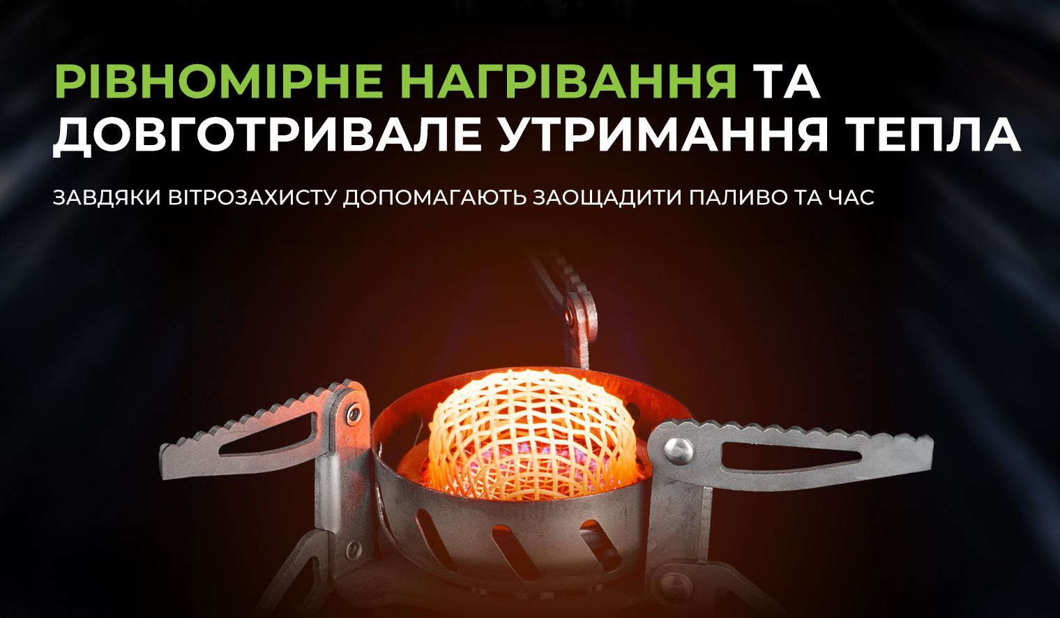 1. Легкий у догляді та чищенні. 2. Відмінно підходить для використання з газовими балонами різних об'ємів. 3. Висока ефективність горіння і швидке нагрівання посуду. 4. Підходить для роботи в будь-яких погодних умовах.