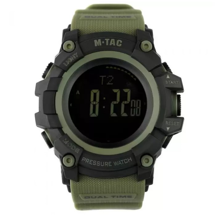 M-Tac годинник Adventure чорний/олива має електронний механізм, поміщений в міцний полікарбонатний корпус. Ободок виконаний з нержавіючої сталі. Скло виконане з органічного полікарбонату, стійке до появи подряпин і відколів. Ремінець довжиною 22 сантиметри зроблений з якісного каучуку. Розмір корпусу - 4,6 сантиметра (діаметр) і 1,4 сантиметра (товщина). Годинник має такі функції: