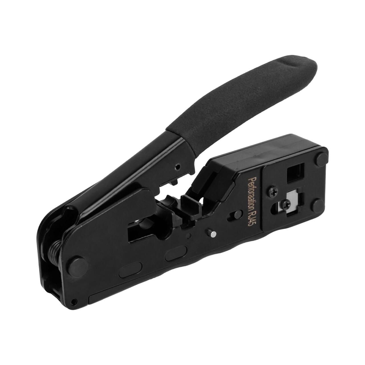 Ручний інструмент для обтискання UTP/STP прохідних конекторів 8P8C/RJ45, а також для телефонних 6P6C/RJ12 та 6P4C/RJ11. Інструмент може бути використаний і для обтиску та стандартних ненаскрізних роз'ємів RJ45. У корпус інструменту вбудована обрізка кабелю і кільцевий затискач для обтиснення екранованого хвостового затискача Shielded Tail Clip. Існує функція перемикання режимів фіксатора кабелю "strain latch", для монтажу роз'ємів різного типу, 5е, 6, 6а, 7, 8 категорії. У конструкції передбачено наявність кнопки блокування "Lock Button", для зручного зберігання та транспортування. Корпус виконаний зі сталі та пластику, у строгому чорному кольорі.