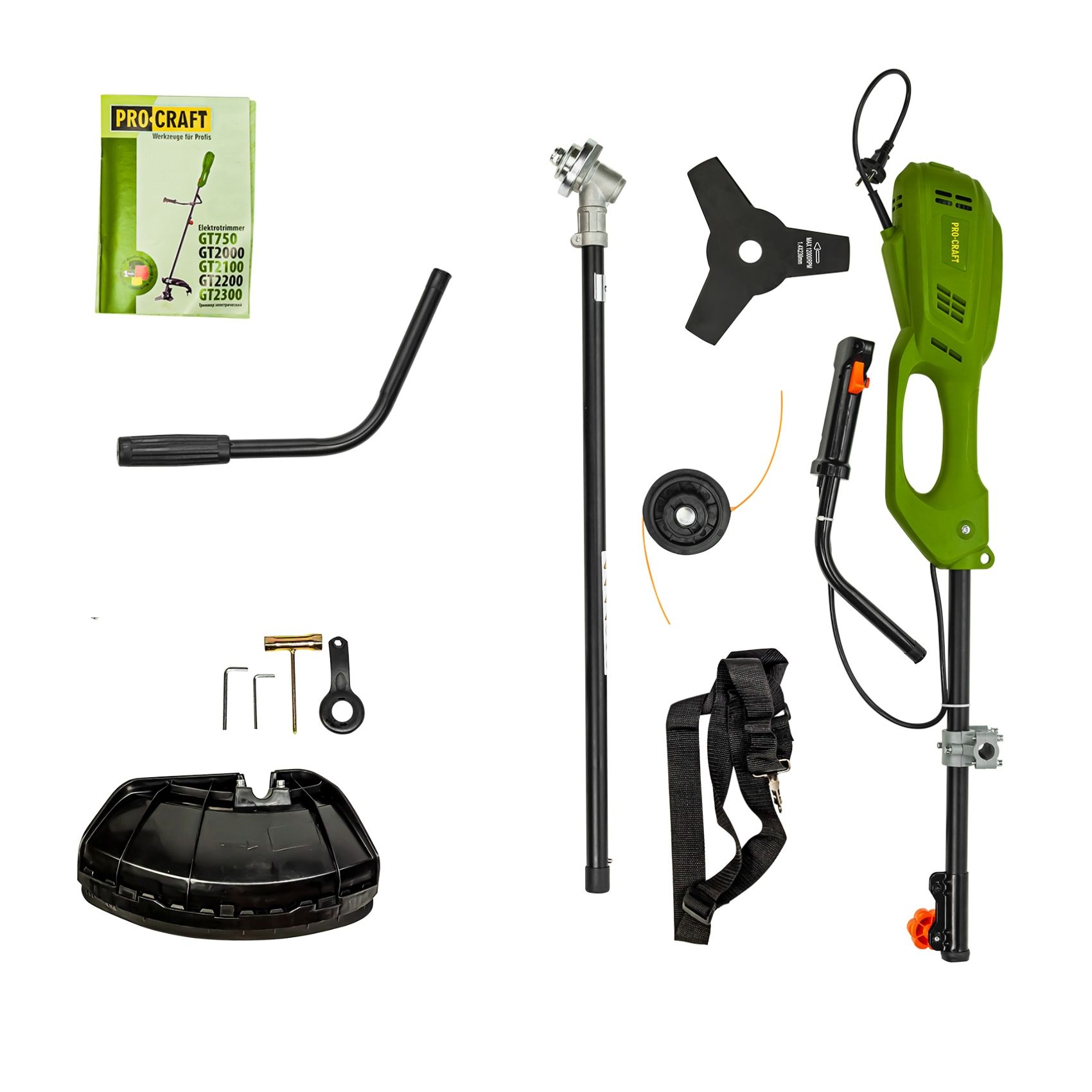 Електричний тример PROCRAFT GT 2200 призначений для догляду за газоном та видалення трави в важкодоступних місцях саду. Живлення здійснюється від мережі 220 В (50 Гц). Інструмент оснащений металевою розбірною штангою, а додаткова рукоять забезпечує зручне управління обома руками. Корпус виготовлений з ударостійкого пластику, а захисний кожух оберігає оператора від можливих травм. Тример підтримує роботу як з ножем, так і з волосінню, що дозволяє ефективно скошувати траву і бур'ян на невеликих ділянках.