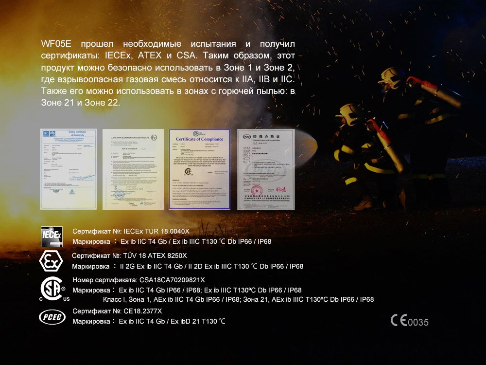Водонепроникність: Ліхтар ручний Fenix WF05E має високий рівень захисту від вологи. Він відповідає стандарту захисту IP68, що дозволяє йому працювати під водою на глибині до 2 метрів.