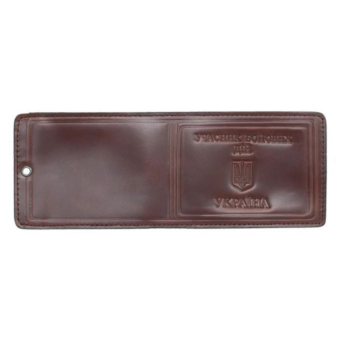 Обкладинка на документи учасника бойових дій призначена для захисту посвідчення від зовнішніх пошкоджень і збереження його охайного вигляду. Виготовлений цей аксесуар із натуральної шкіри. Матеріал міцний, стійкий до стирання й має показний вигляд. Обкладинка виготовлена у формі прямокутної книжечки. Усередині прозорі віконця. Фронтальна зовнішня сторона має тиснення з написом "Учасник бойових дій Україна" и рисунок трезубца. Виготовлений цей аксесуар в Україні. Можливий вибір кольору: коричневий або чорний.
