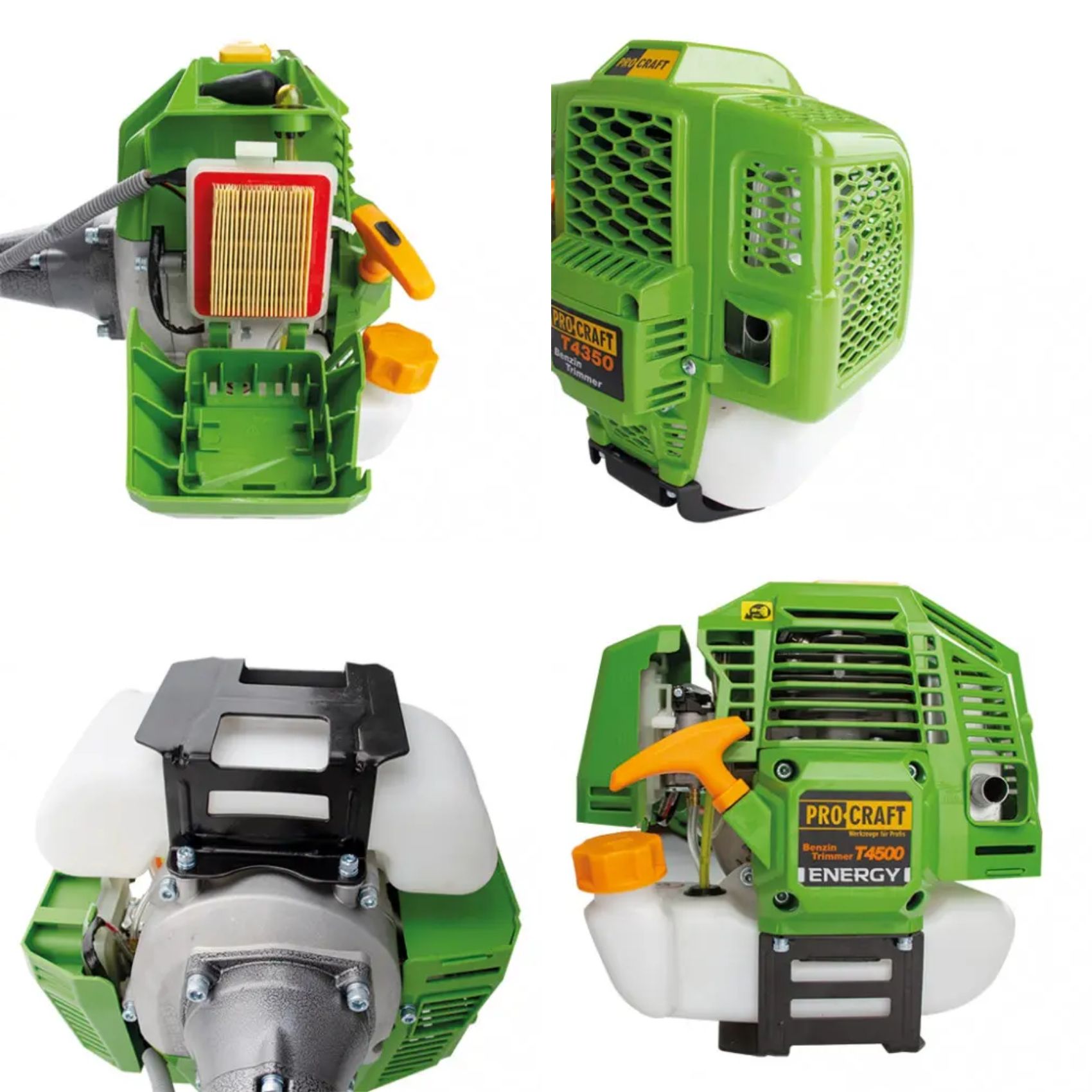 Коса бензинова Procraft T5600 (Чотирьохтактний двигун) це мотокоса професійного класу, зібрана з якісних комплектуючих. Дана модель має 4-х тактний бензиновий двигун, який значно тихіше працює і споживає мало палива. Встановлена система запалювання та стартер із системою легкого пуску дозволяє легко запускати мотор. Ручка газу має додатковий важіль для фіксації обертів двигуна в оптимальному режимі. Спеціальне захисне покриття поршневої дозволяє значно збільшити термін служби бензокоси.