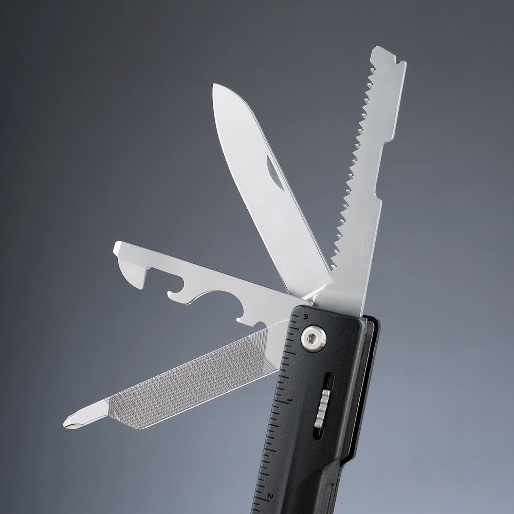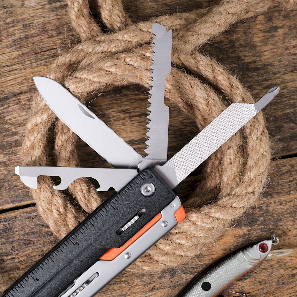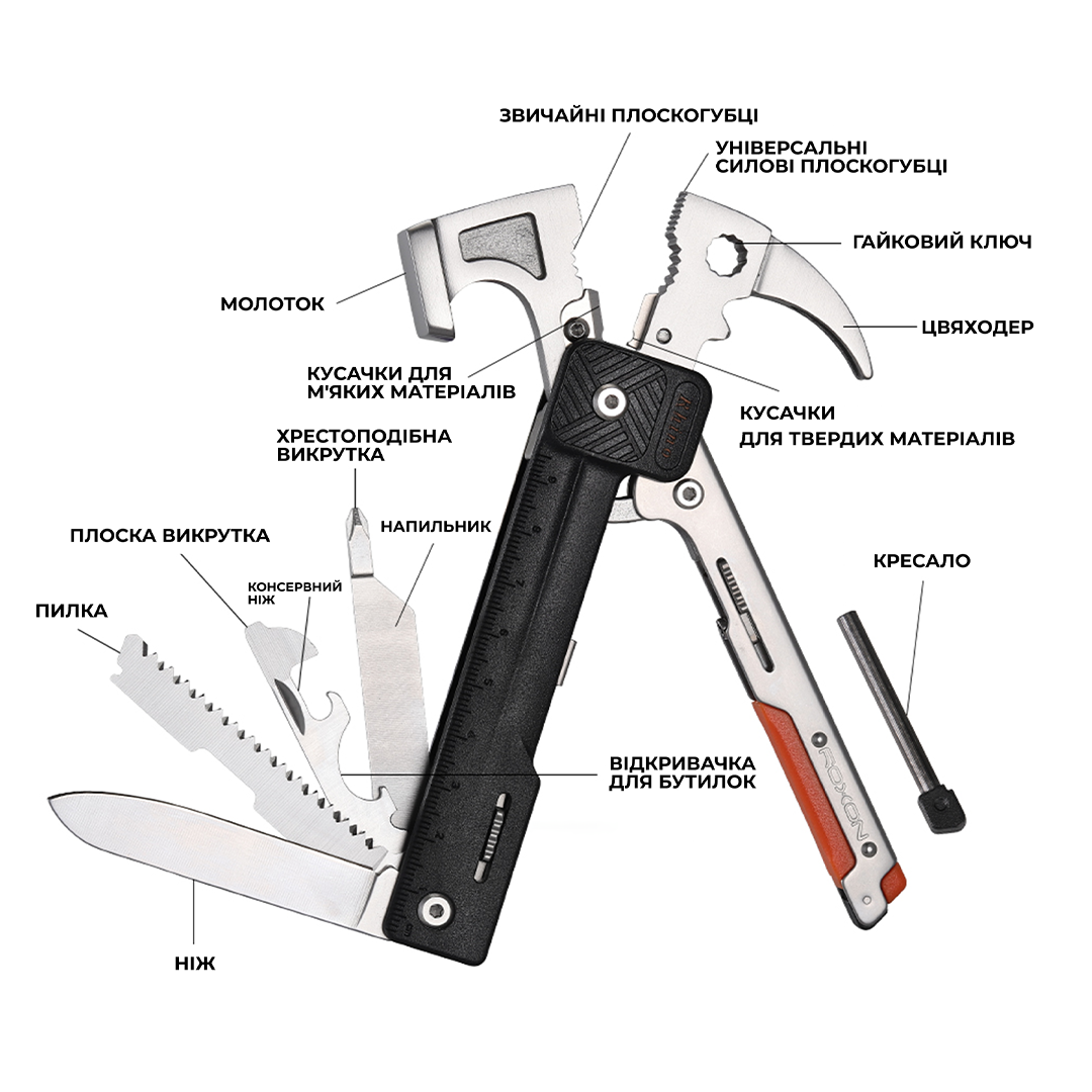 Функціональність: Має різні функції, такі як молоток, гвинтокрут, плоскогубці, ніж, пила та інші, що дозволяє виконувати різноманітні ремонтні роботи
