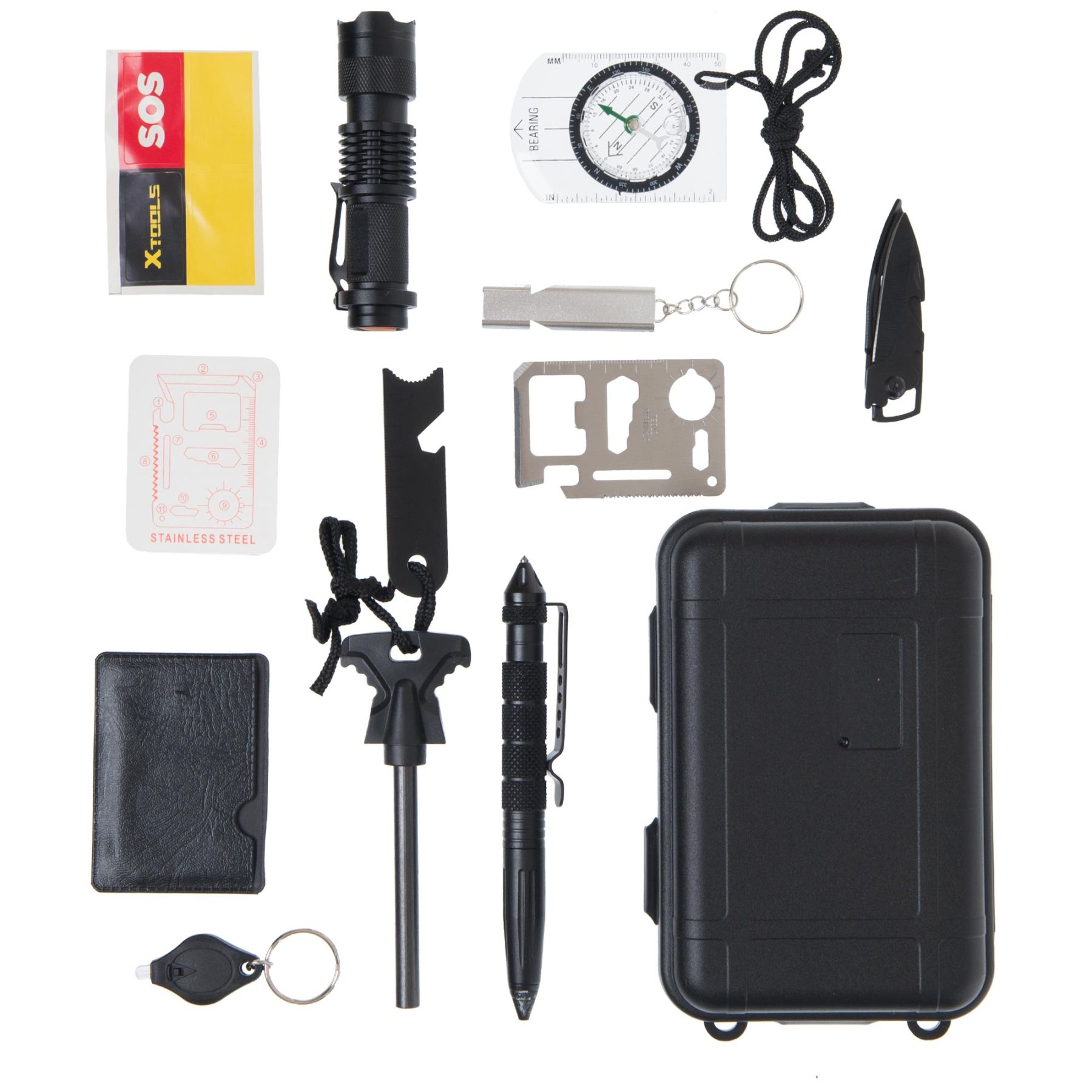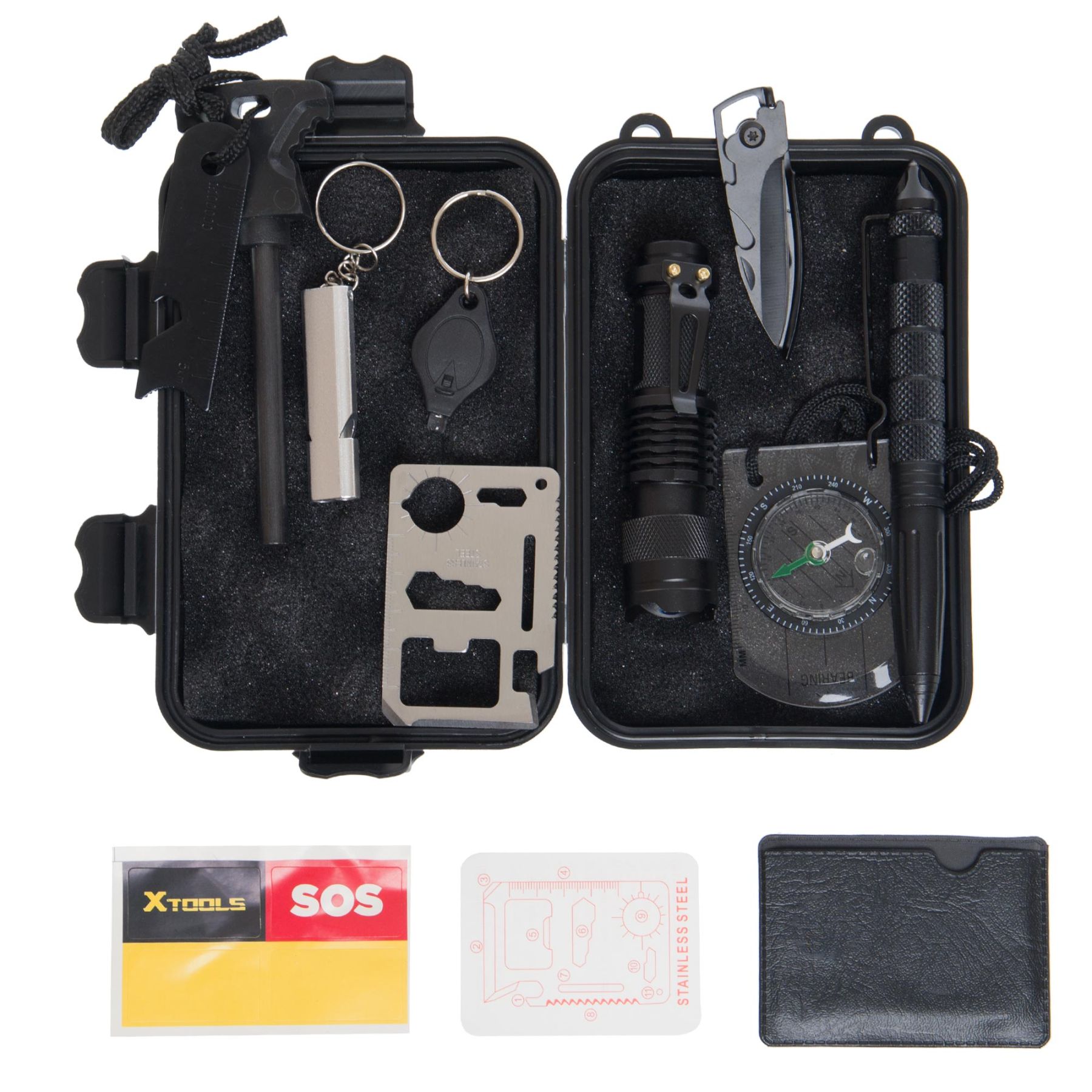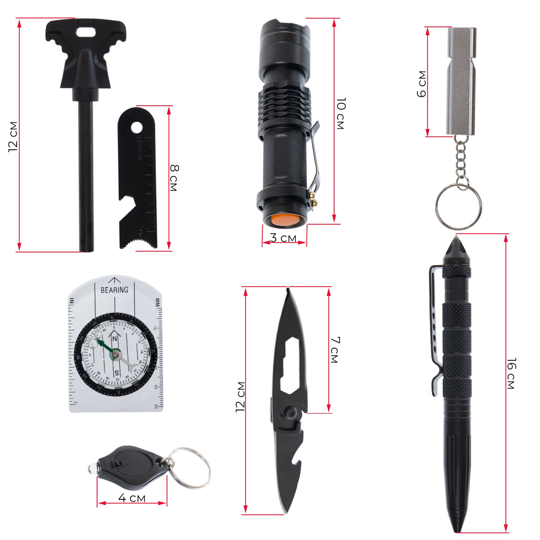 Набір містить такі унікальні властивості: ніж, лопату, веревку, сірниковий коробок, фонарик, компас, сигнальний свисток та багато іншого. Він дозволяє вам бути готовими до будь-яких ситуацій і забезпечує вашу безпеку та комфорт у дикій природі.