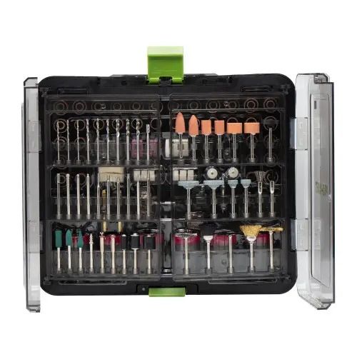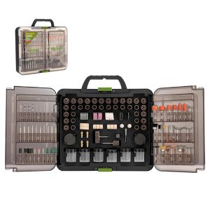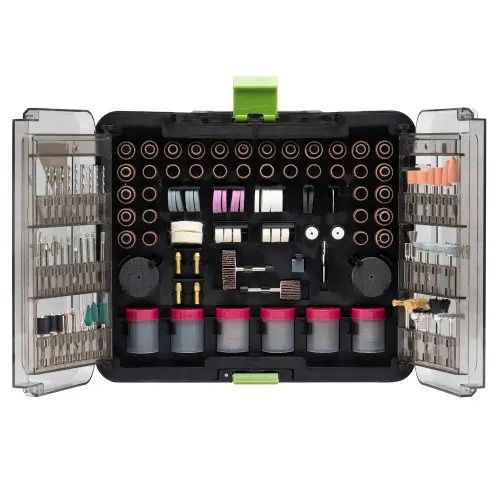 У наборі 418 елементів, серед яких: абразивні диски, фрези, щітки, полірувальні насадки, свердла та інші допоміжні аксесуари. Всі компоненти виготовлені з якісних матеріалів, що забезпечують довговічність і ефективність.