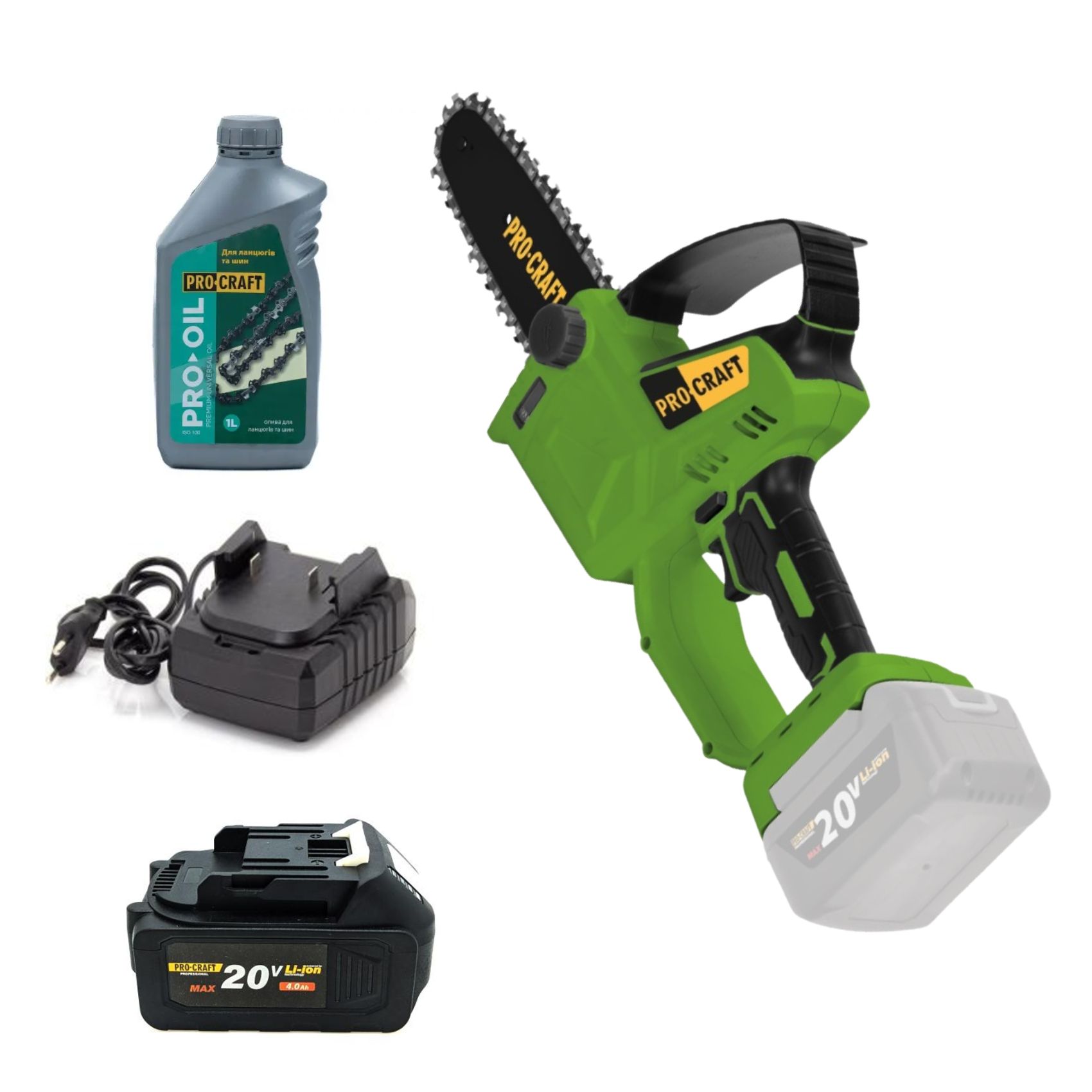 Набір Пила ланцюгова акумуляторна PRO-CRAFT PKA30/Батарея 20/4UNIVERSAL/Зарядний пристрій 20/1/Олива 1л підходить для використання в господарстві, лісорозтинних роботах, будівництві та для особистого використання. Ідеально підходить для обробки деревини, розпилу пнів, підготовки дров та виготовлення дерев'яних конструкцій.