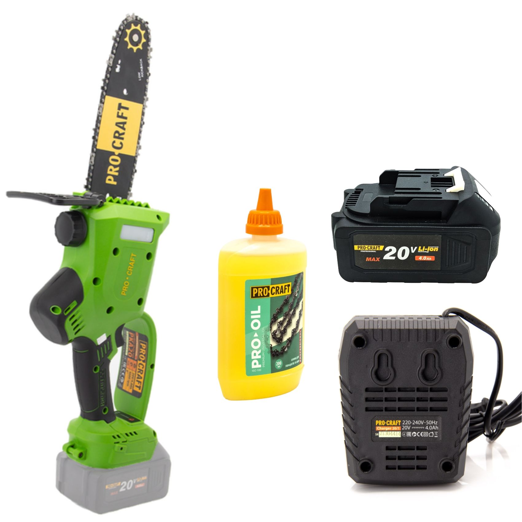 Комплектація включає акумулятор, зарядний пристрій, масло для змащування, що робить Procraft РКА 20/4 готовою до використання одразу після придбання. Плавний пуск і бічний натяг ланцюга забезпечують безпечну і точну роботу.