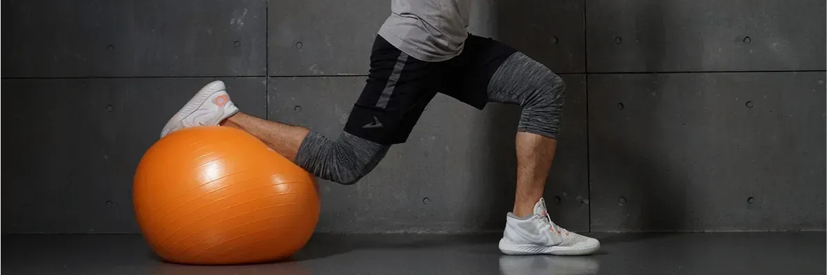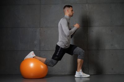Станьте спиною до м'яча, закиньте одну ногу на фітбол. Згинаючи коліно, робіть випади, зберігаючи стабільне положення.