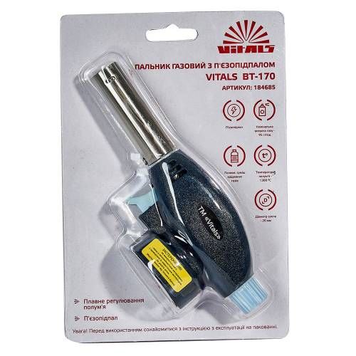 Пальник газовий з п'єзопідпалом Ø20 мм Vitals BT-170 призначений для розпалювання багать та мангалів, хобі та моделювання, паяння з'єднань труб, видалення фарби, розігріву замерзлих водопровідних труб.