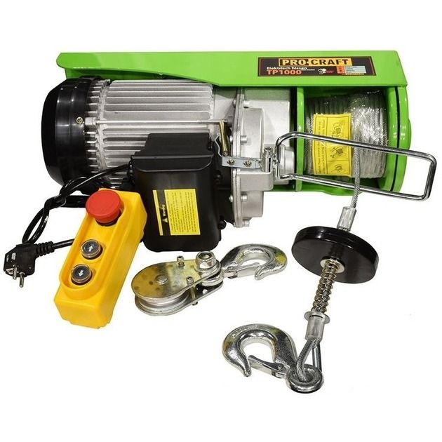 Тельфер вертикального типу PROCRAFT ТР1000 - складна підйомна система. Базис механізму підйому - синхронний електродвигун. Основою структури підйомника є каркас, виконаний з високоміцного сплаву сталі з підвищеним вмістом вуглецю. На каркасній складовій закріплені направляючі елементи.