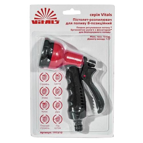 Інші унікальні властивості та переваги пістолета-розпилювача 8-позиційного пластикового Vitals: - Можливість налаштування режиму струменя від м'якого до потужного - Висока якість матеріалів забезпечує надійну роботу і довговічність - Легкий у використанні і зручний для перенесення - Забезпечує рівномірний розподіл води для оптимального поливу - Підходить для використання у будь-якій погоді