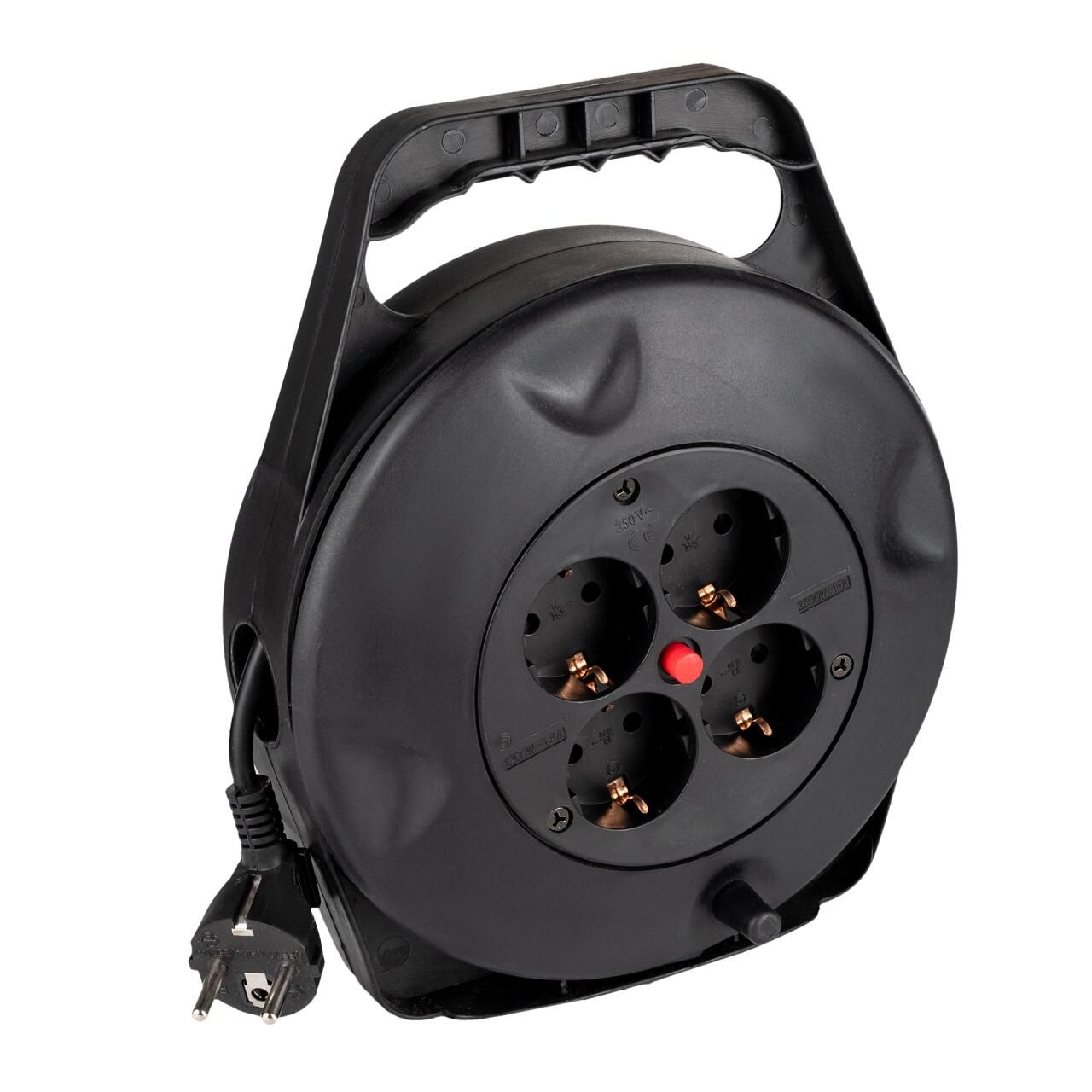 Подовжувач на котушці оснащений литою вилкою, а на корпусі подовжувача вставка з 4-місною розеткою.