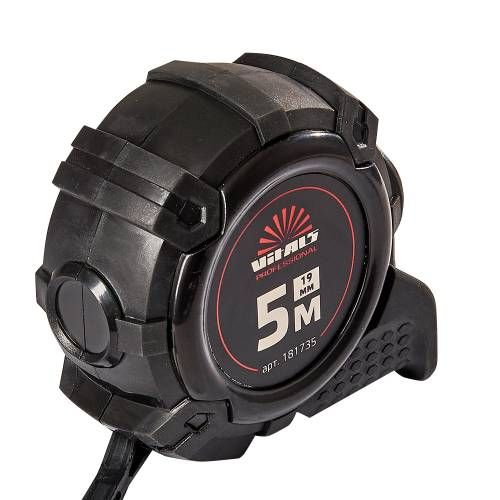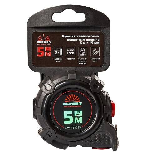 Рулетка гумова з нейлоновим покриттям полотна 5 м × 19 мм автостоп Vitals Professional - ідеальний інструмент для точного вимірювання відстаней. Вона має надійний корпус з АБС-пластика з гумовим покриттям, що забезпечує комфортний захоп і захищає рулетку від пошкоджень. Довжина стрічки - 5 метрів, ширина - 19 мм, що дозволяє зручно вимірювати різні розміри і відстані. Металевий автостоп зупиняє рулетку і утримує її на потрібній відстані. Ця рулетка є надійною та зручною у використанні, ідеально підходить для будівельних та ремонтних робіт.