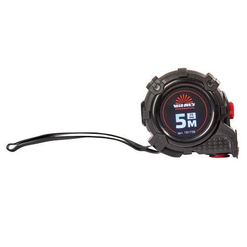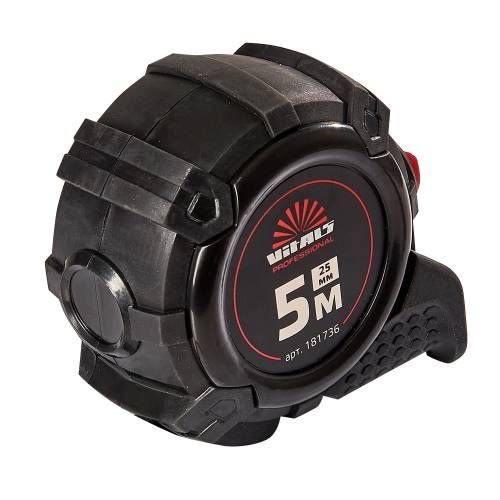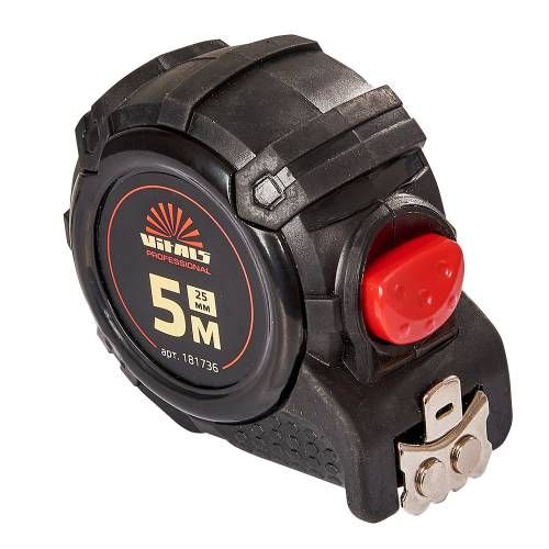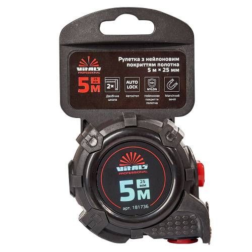 Рулетка гумова з нейлоновим покриттям полотна 5 м × 25 мм автостоп Vitals Professional підходить для вимірювання відстаней та розмірів у будівельній справі, ремонті та в широкому спектрі домашніх завдань.