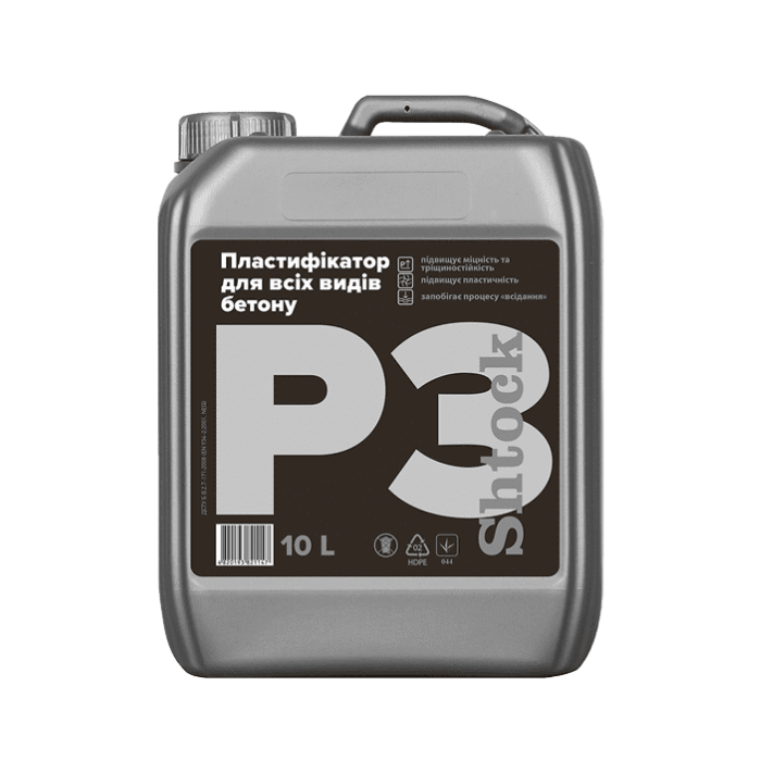 Основні переваги пластифікатора Р3 Shtock: покращує пластичність і морозостійкість бетону, готово до застосування, зручна упаковка, висока якість.