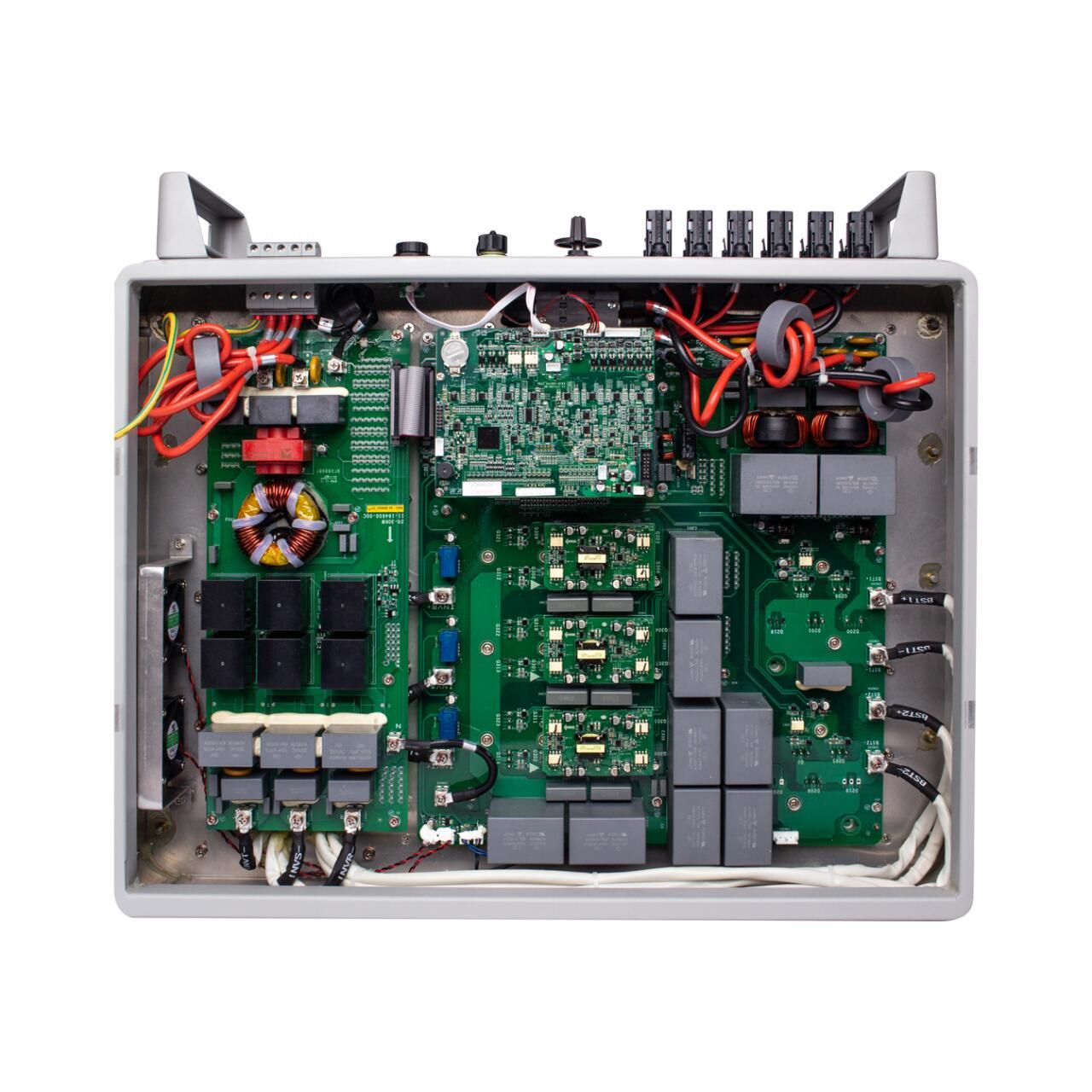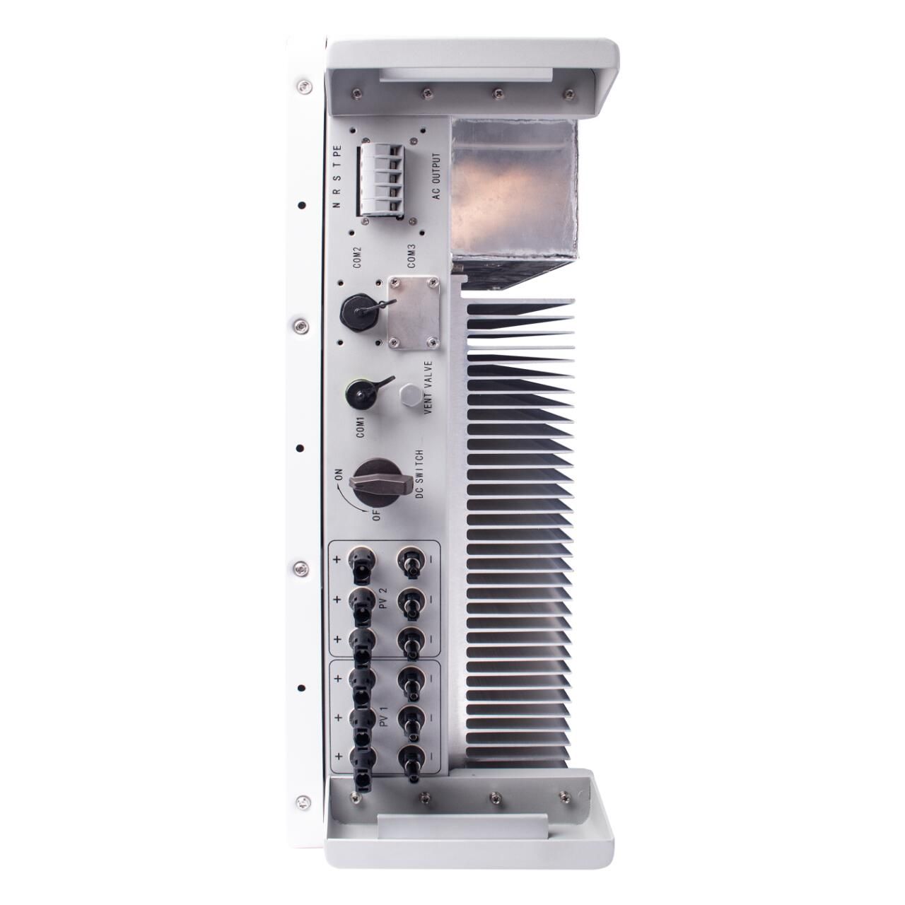 Інвертор для сонячних батарей перетворює постійний струм, згенерований фотомодулями (діапазон напруг 300-800 В), у вихідну напругу змінного струму 380В. Два високошвидкісних МППТ трекери працюють з використанням новітньої технології ідентифікації зміни потужності (найвищий клас точності вимірювання показників).