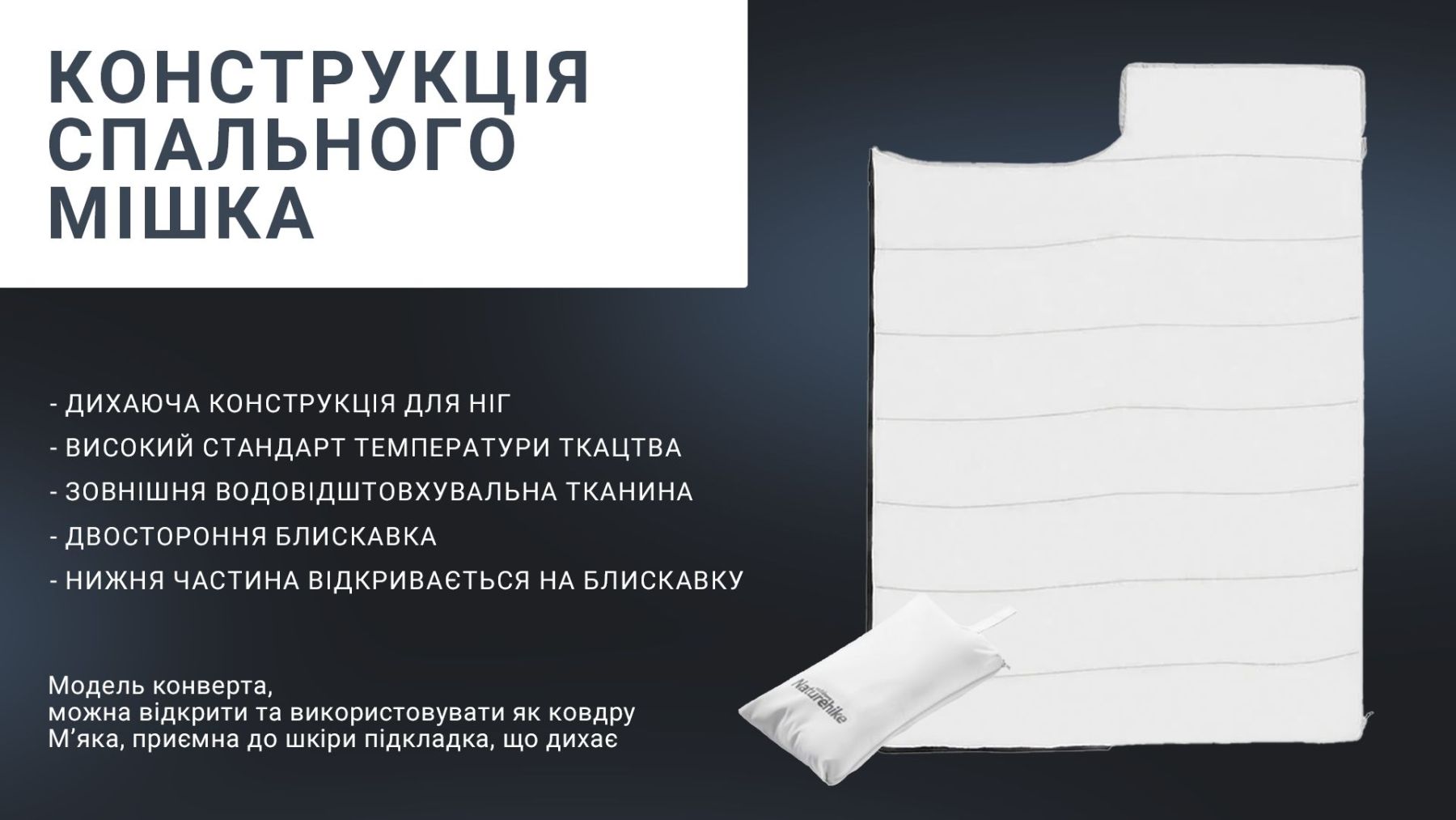Інші унікальні властивості та переваги спального мішка Naturehike NH22MSD01: - Захист від вологи та вентиляція - Легко чиститься та швидко сохне - Зручна упаковка для зберігання та перенесення - Висока якість пошиву та міцні шви - Забезпечує комфортний сон в будь-яких умовах