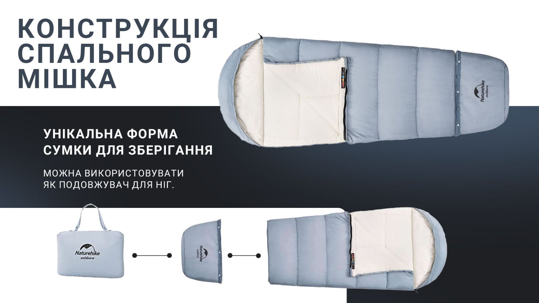 Додаткові унікальні властивості та переваги дитячого спальника Naturehike С300 NH21MSD01: - Має практичний капюшон, який додатково захищає голову від вітру і холоду - Є зручний затяжний шнурок, що дозволяє підлаштувати спальник під ваші потреби - Може використовуватись як покривало або одіяло - Легко миється і швидко сохне - Довговічний і надійний - Ідеальний варіант для активного відпочинку з дітьми.