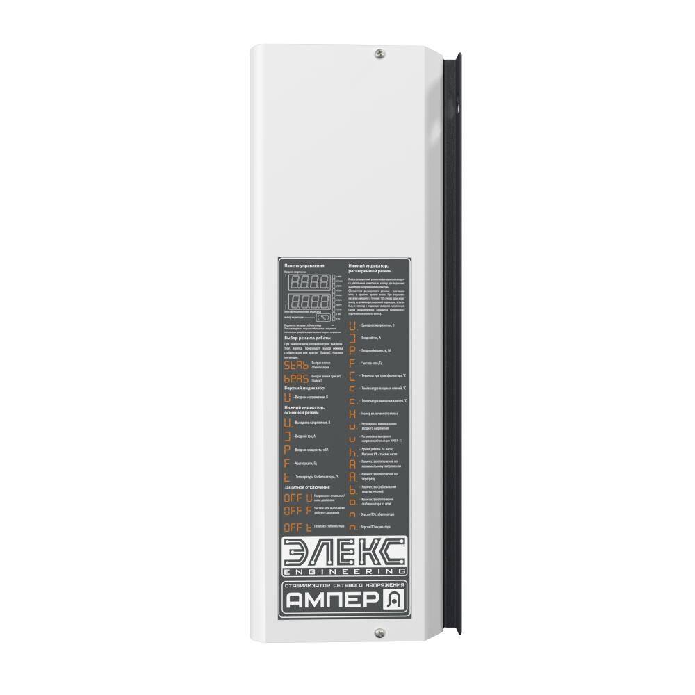 Однофазний стабілізатор напруги Ампер-Р У 16-1/32 v2.1 (розширений) призначений для роботи в електричних мережах з коливаннями напруги від 120 до 275В. У цьому діапазоні апарат гарантовано видає на виході напругу в рамках 220±3,5%, що забезпечується за рахунок використання 16 ступенів стабілізації. Номінальна потужність цієї моделі 7 кВт, що відповідає робочому струму автоматичного вимикача 32А на ньому.