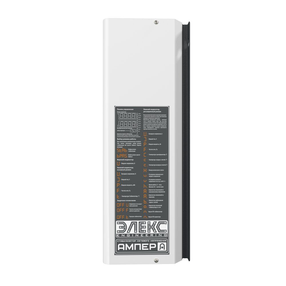 Однофазний стабілізатор напруги Ампер-Р У 16-1/40 v2.1 (розширений) призначений для роботи в електричних мережах з коливаннями напруги від 120 до 275В. У цьому діапазоні апарат гарантовано видає на виході напругу в рамках 220±3,5%, що забезпечується за рахунок використання 16 ступенів стабілізації. Номінальна потужність цієї моделі 9 кВт, що відповідає робочому струму автоматичного вимикача 40А на ньому.