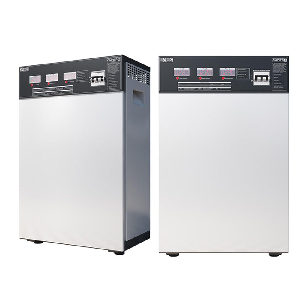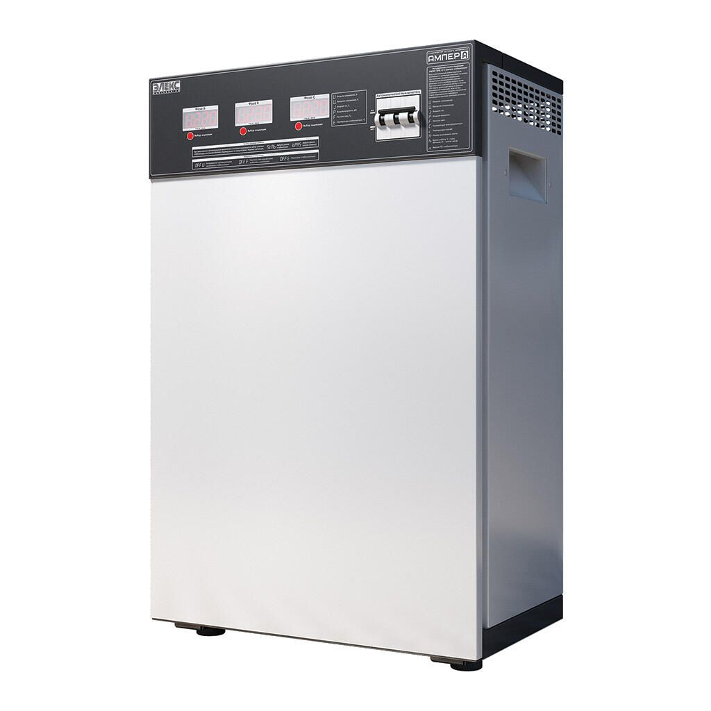 Трифазний стабілізатор напруги Ампер У 12-3/50 v2.0 призначений для роботи у трифазних електричних мережах з коливаннями напруги від 145 до 275В. У цьому діапазоні апарат гарантовано видає на виході напругу в межах 220±3,5%, що забезпечується за рахунок використання 12 ступенів стабілізації. Загальна номінальна потужність цієї моделі 33 кВт (11 кВт на фазу), що відповідає робочому струму автоматичного вимикача 50 А на ньому.
