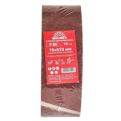 Основні переваги стрічки шліфувальної Vitals 75х533 мм з. 80: - Універсальність: підходить для шліфування різних матеріалів - Велика кількість в упаковці: 10 стрічок шліфувальних - Забезпечує якісне шліфування: розмір зерна P80 - Компактний розмір: 75х533 мм - Довговічність і надійність - Зручна у використанні