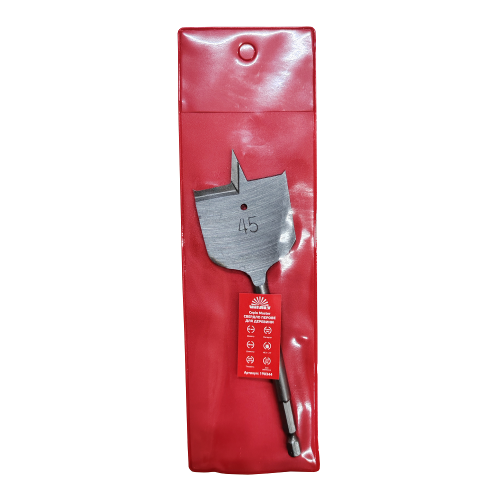 Свердло для дерева пір'яне 45 мм Vitals Master це високоякісний інструмент з матеріалу сталь С45, призначений для свердління отворів в дереві. Загальна довжина свердла становить 150 мм, а діаметр - 45 мм. Хвостовик має шестигранну форму, що забезпечує надійне утримання в патроні. Твердість ріжучого леза становить 45-49 HRC, що дозволяє ефективно свердлити дерево без деформацій і поламок.