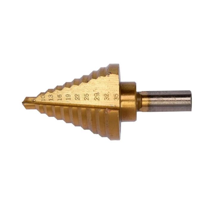 Свердло конічне ступінчасте титанове по металу YATO забезпечує ефективне свердлення отворів діаметром від 6 до 35 мм. Виготовлене з високоякісної сталі HSS 4241, що забезпечує йому високу міцність та довговічність. Робоча довжина свердла становить 45 мм, що дозволяє свердлити глибокі отвори. Циліндричний хвостовик забезпечує стабільне кріплення свердла в пристрої для свердління. Завдяки своїм характеристикам, це свердло ідеально підходить для роботи з металом.