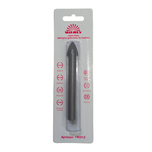 Переваги свердла пікоподібного по склу та плитці 12 мм Vitals: висока якість виготовлення, довговічність, ефективність свердління, використання унікальних матеріалів для досягнення високої твердості ріжучого леза.