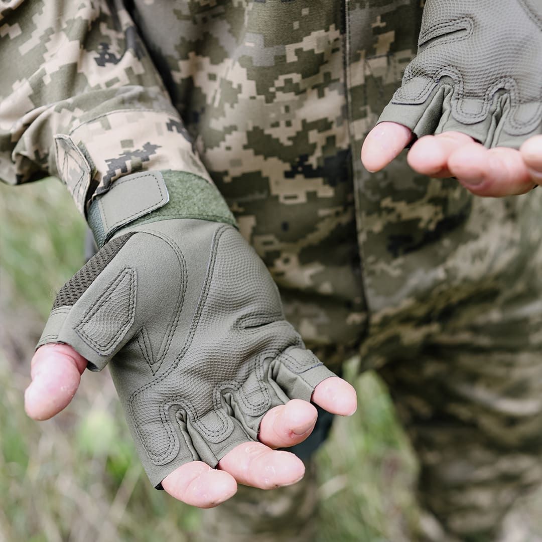 Ці тактичні рукавички без пальців виконані у кольорі оливкового відтінку. Вони мають розмір M, що підходить для середнього розміру долоні. Рукавички забезпечують гарний захист рук під час спортивних тренувань або зовнішніх активностей. Вони добре тримаються на руці завдяки резиновому поясу на зап'ясті. Матеріал, з якого виготовлені рукавички, має високу міцність і стійкість до зношування. Вони також дуже легкі та зручні у використанні. Завдяки відсутності пальців, руки не будуть обмежуватися в русі. Такі рукавички чудово підходять для активних людей, які цінують комфорт та захист своїх рук.
