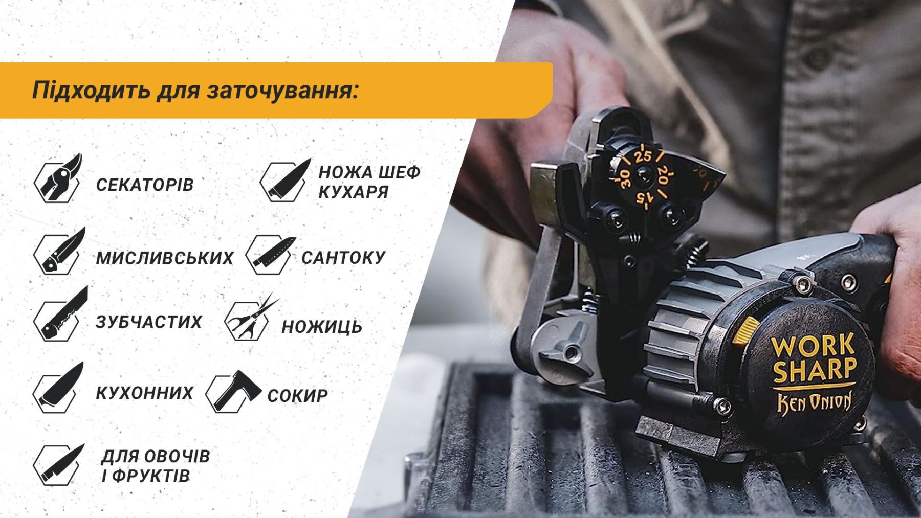 Інші унікальні властивості і переваги точилки Work Sharp Ken Onion Edition KTS: - Можливість заточування ножів з різними формами леза - Можливість створення вирізів і подрібнень на лезі ножа - Компактні розміри і легка вага точилки - Наявність вбудованого попереднього шліфування - Можливість заточування ножів з різними розмірами і товщиною леза