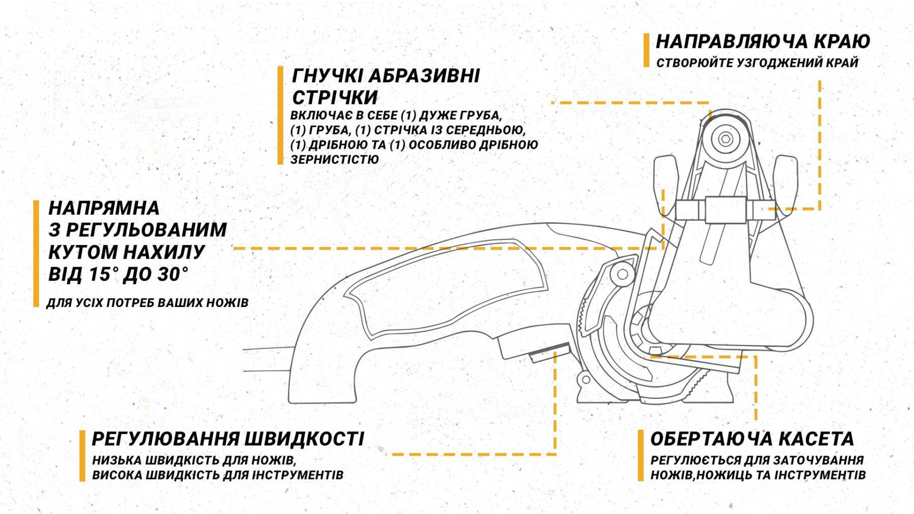 Регульовані кути заточування: Точилка дозволяє налаштовувати кути заточування від 15 до 30 градусів, що дозволяє підібрати оптимальний кут для конкретного ножа.