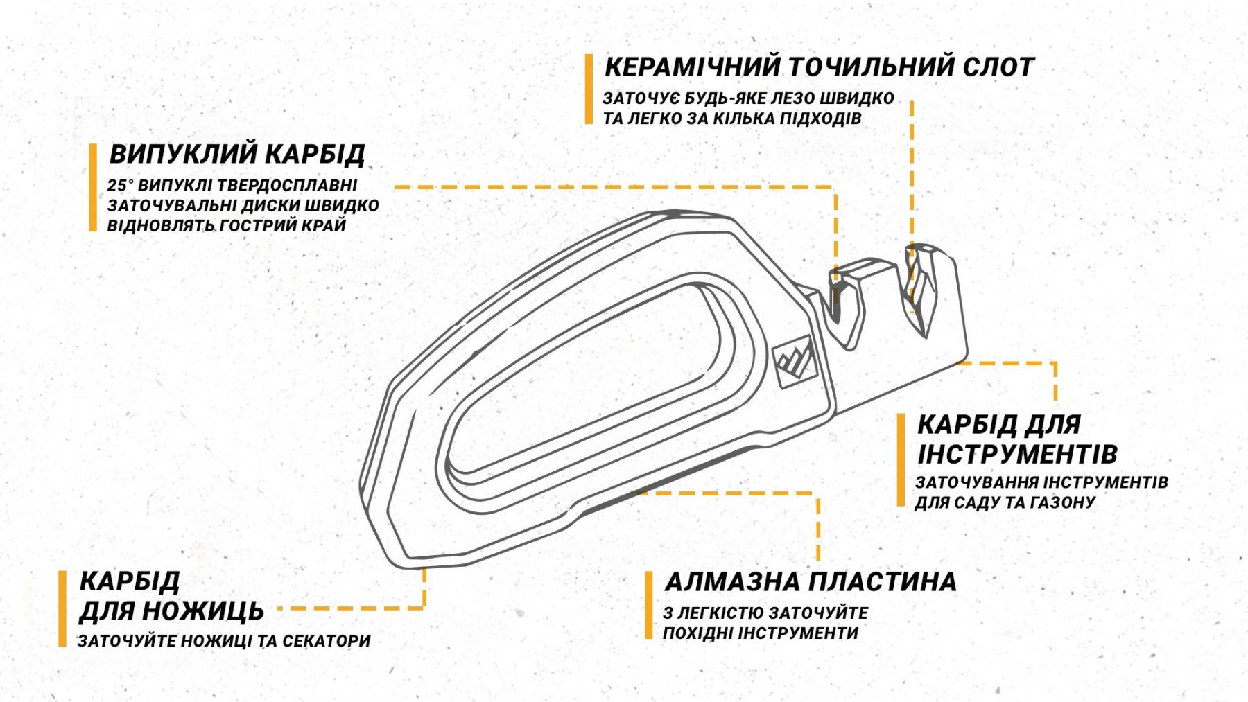 Інші унікальні властивості товару: - Заточка ріжучих інструментів займає мінімум часу і зусиль. - Відмінна стабільність точного кута заточування. - Зручна ручка для комфортного тримання. - Економія коштів на заміні ножів інструментів. - Висока ефективність у використанні.