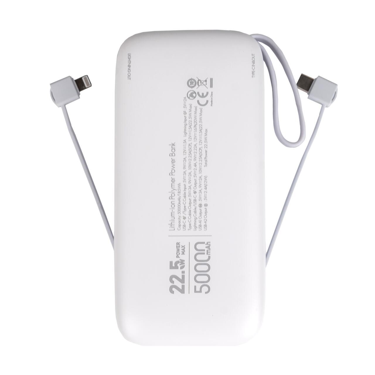 Power Bank оснащений вбудованим зарядним кабелем, сумісним з різними типами пристроїв: USB-C і Lightning. Це означає, що вам не потрібно турбуватися про наявність додаткових проводів - все необхідне знаходиться під рукою.